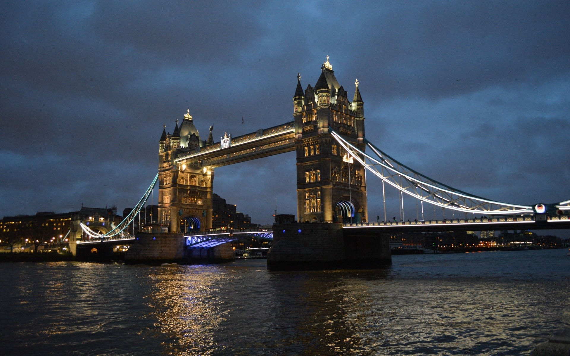 Primo piano del supporto del ponte sospeso di nottePrimo piano del supporto del ponte sospeso di notte