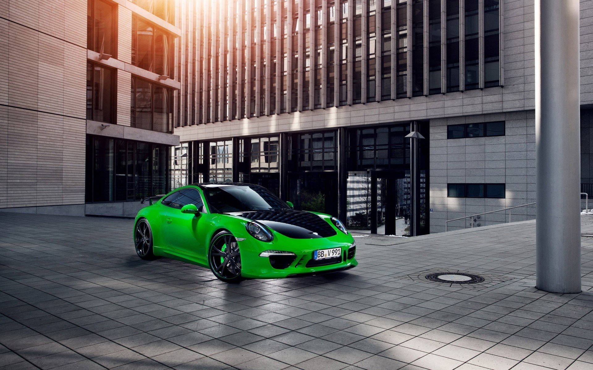 Porsche verde sul marciapiede vicino all'edificio moderno