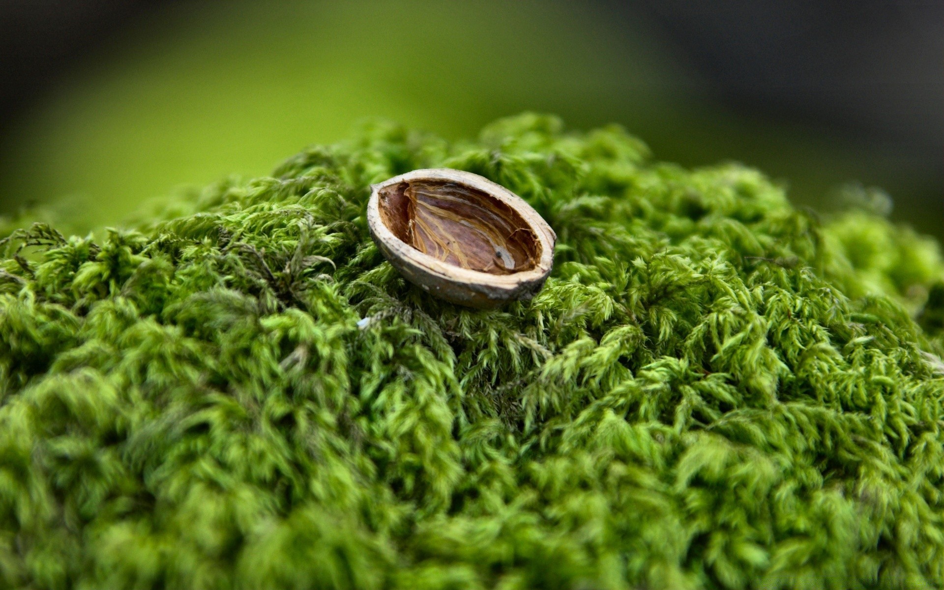 Close-up di un guscio di noce solitario sdraiato sul muschio verde