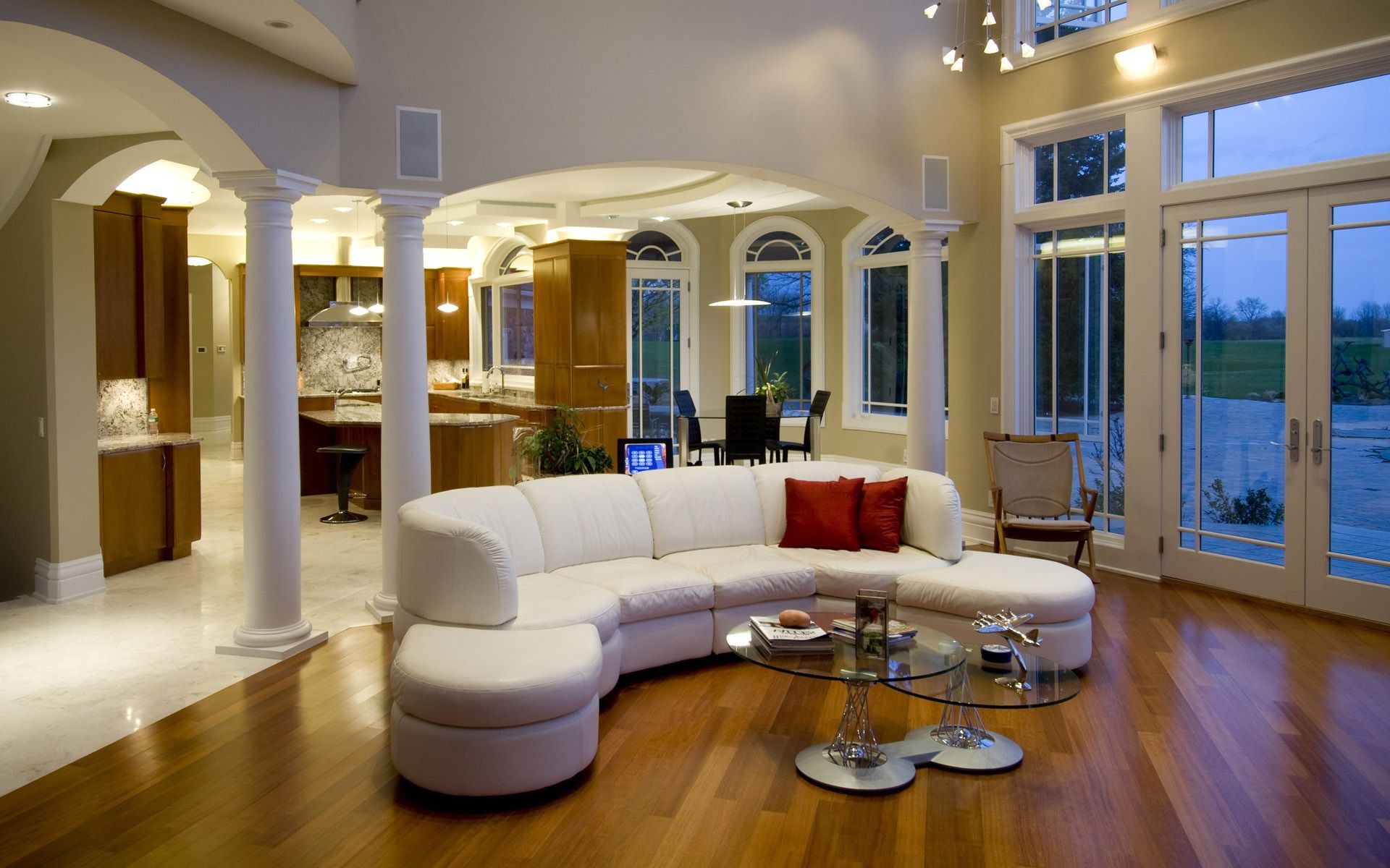 Divano bianco e luce notturna sul tavolo contro piastrelle marroni e pavimento lucido