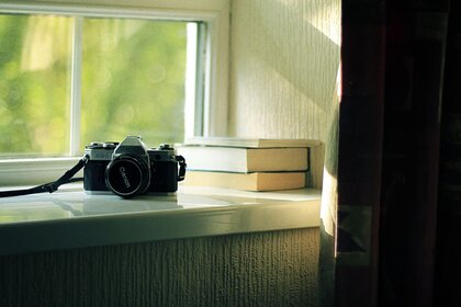 Macchina fotografica sul davanzale della finestra vicino ai libri