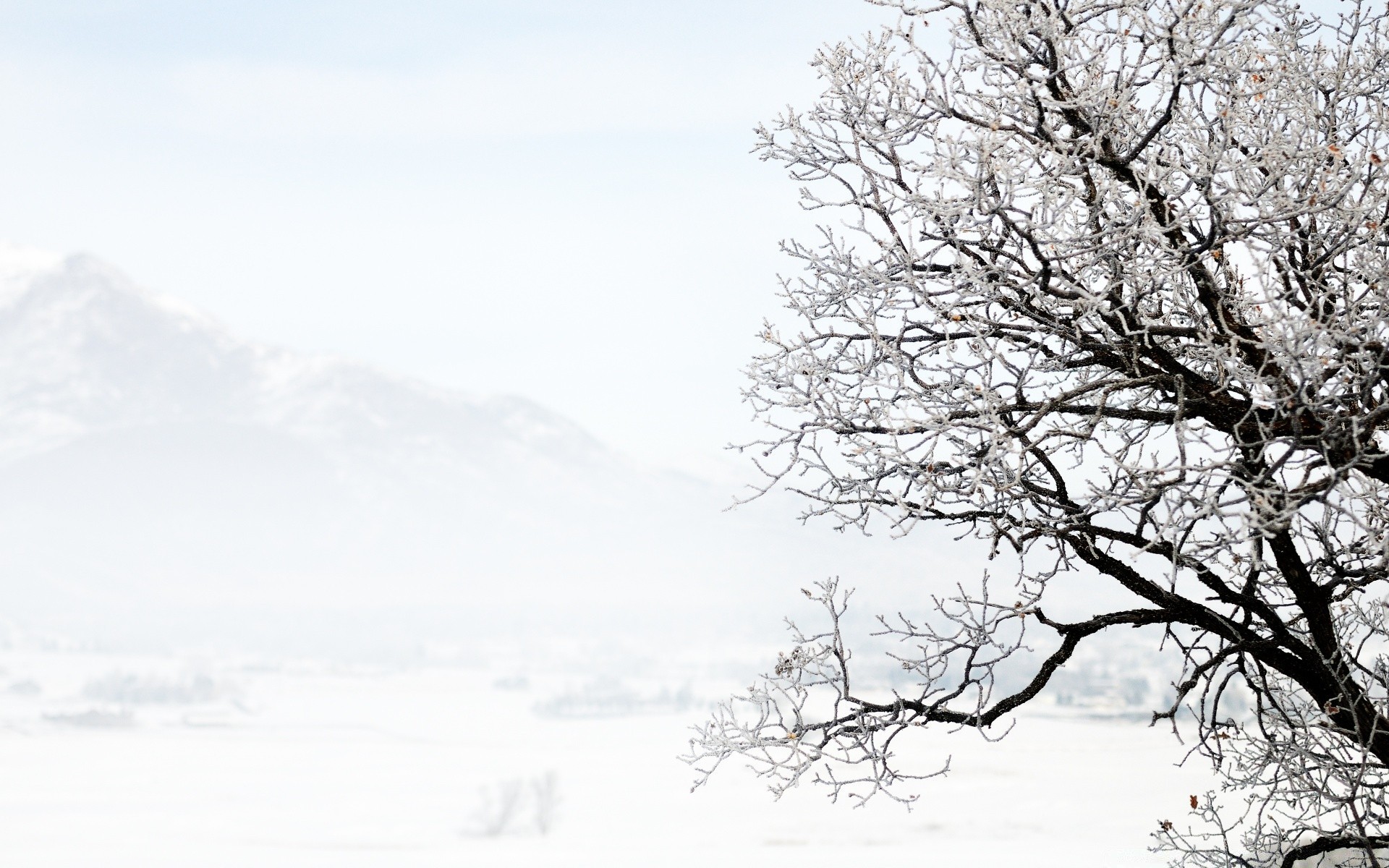 Albero in primo piano con sfondo invernale e montagneAlbero in primo piano con sfondo invernale e montagne