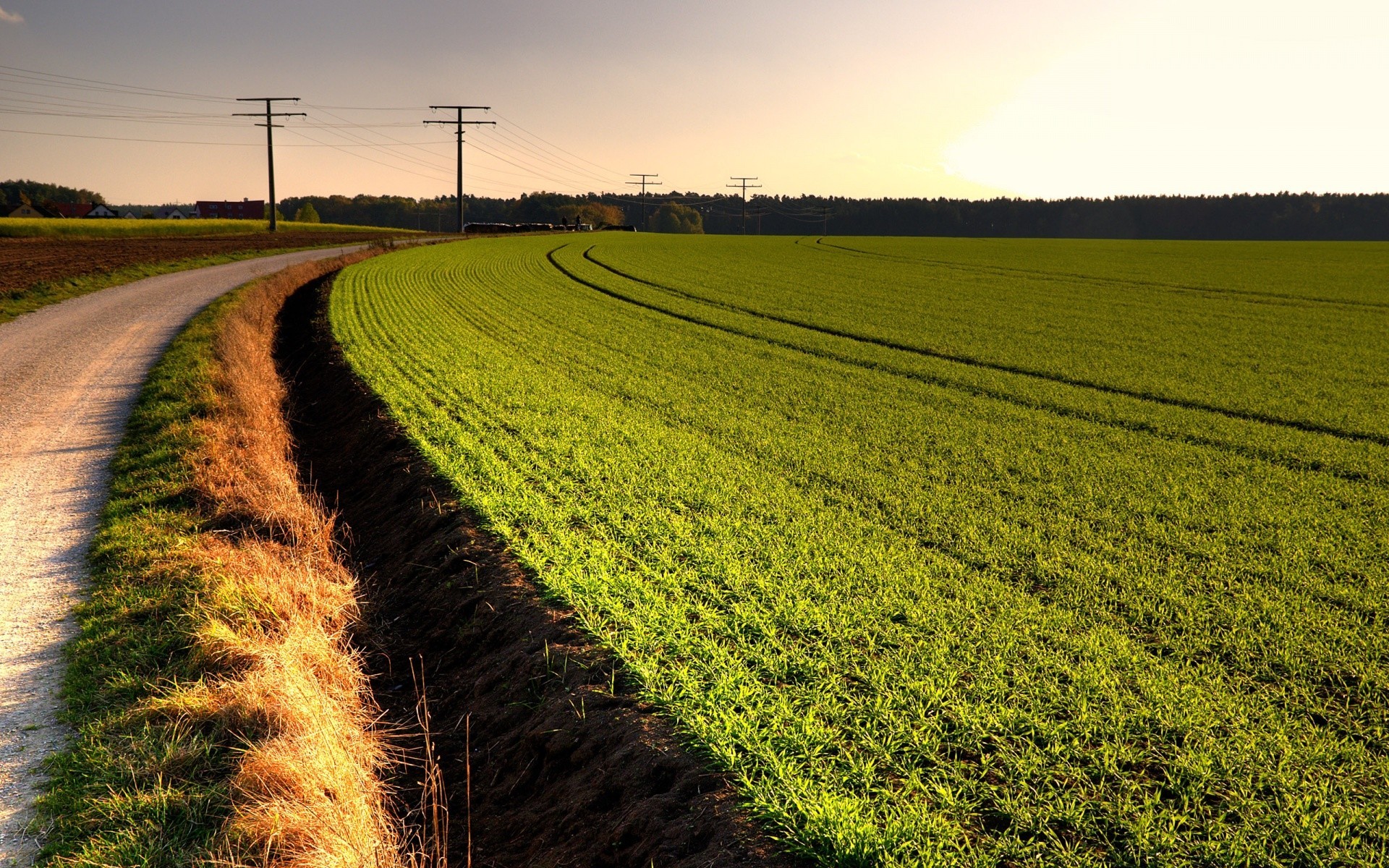Foto di un trattore in un campo su uno sfondo di cielo nuvoloso al tramonto