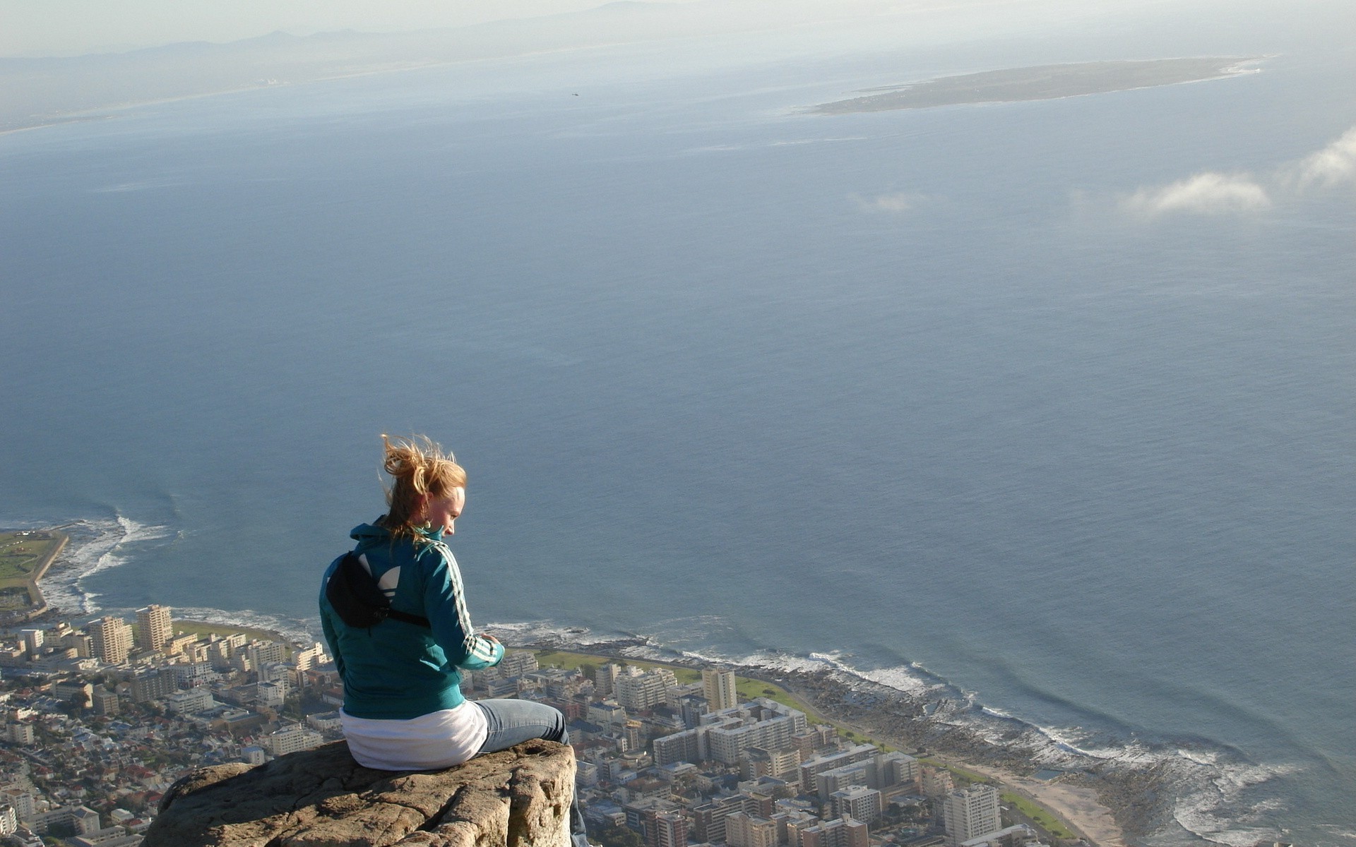 Ragazza coraggiosa seduta sul bordo di una scogliera sopra la città