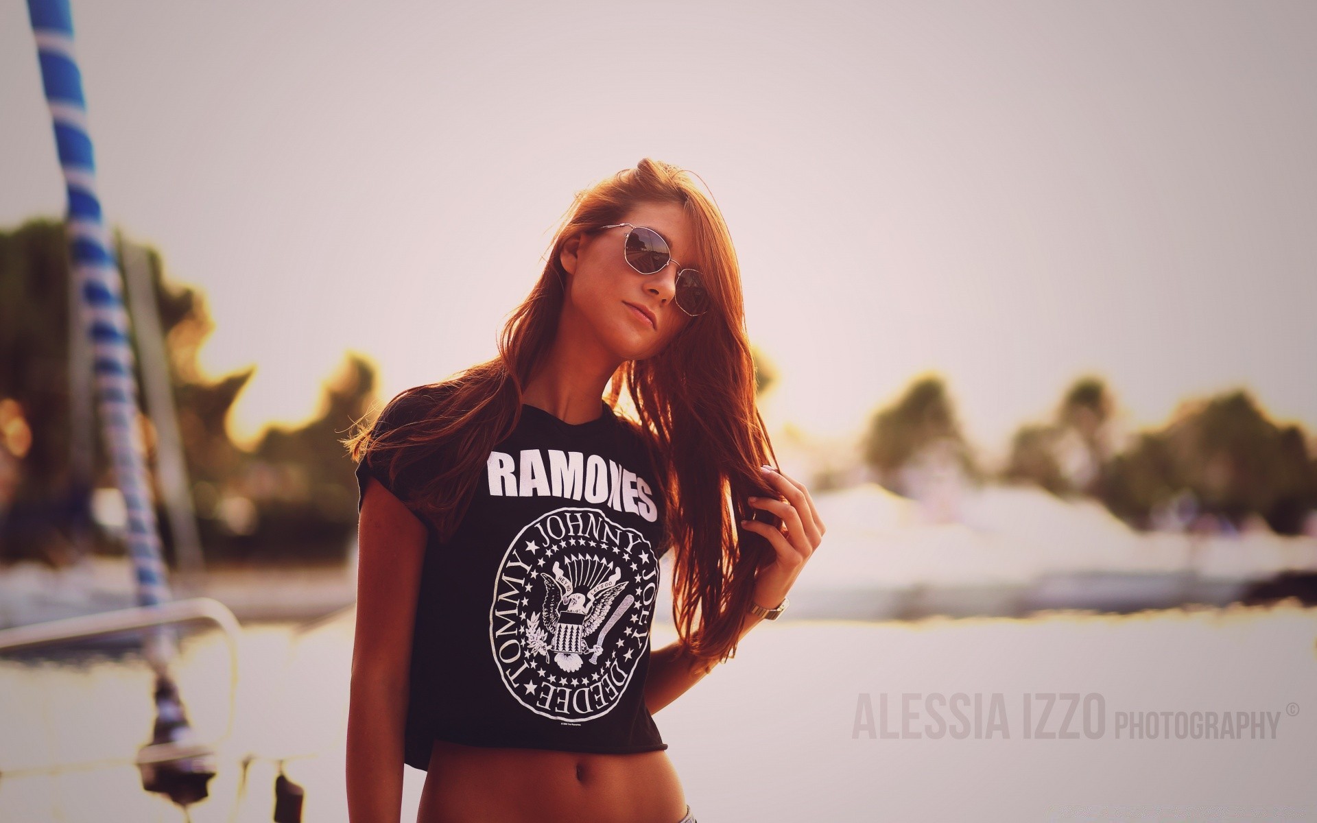 Bionda in t-shirt e occhiali da sole