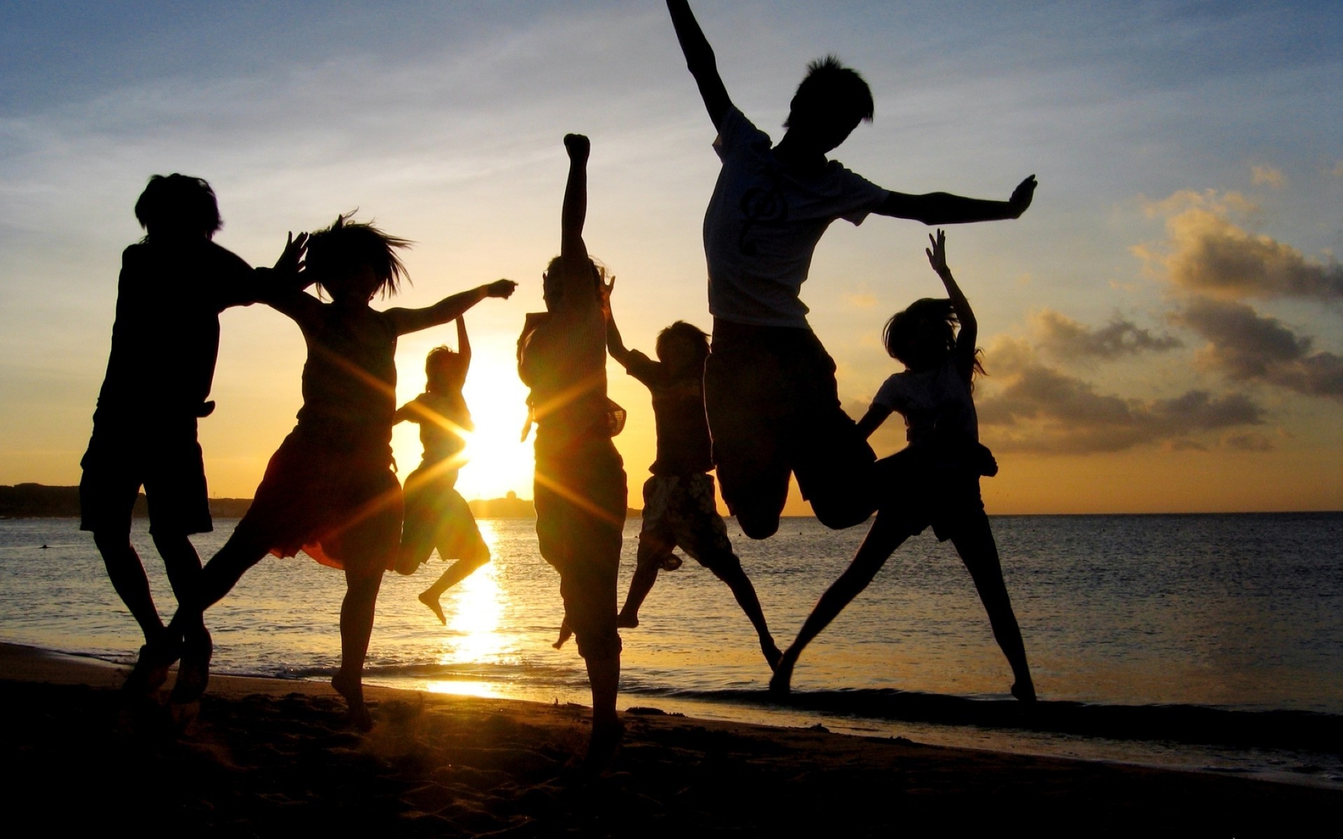Gruppo di giovani ragazzi sulla spiaggia in tempo soleggiato