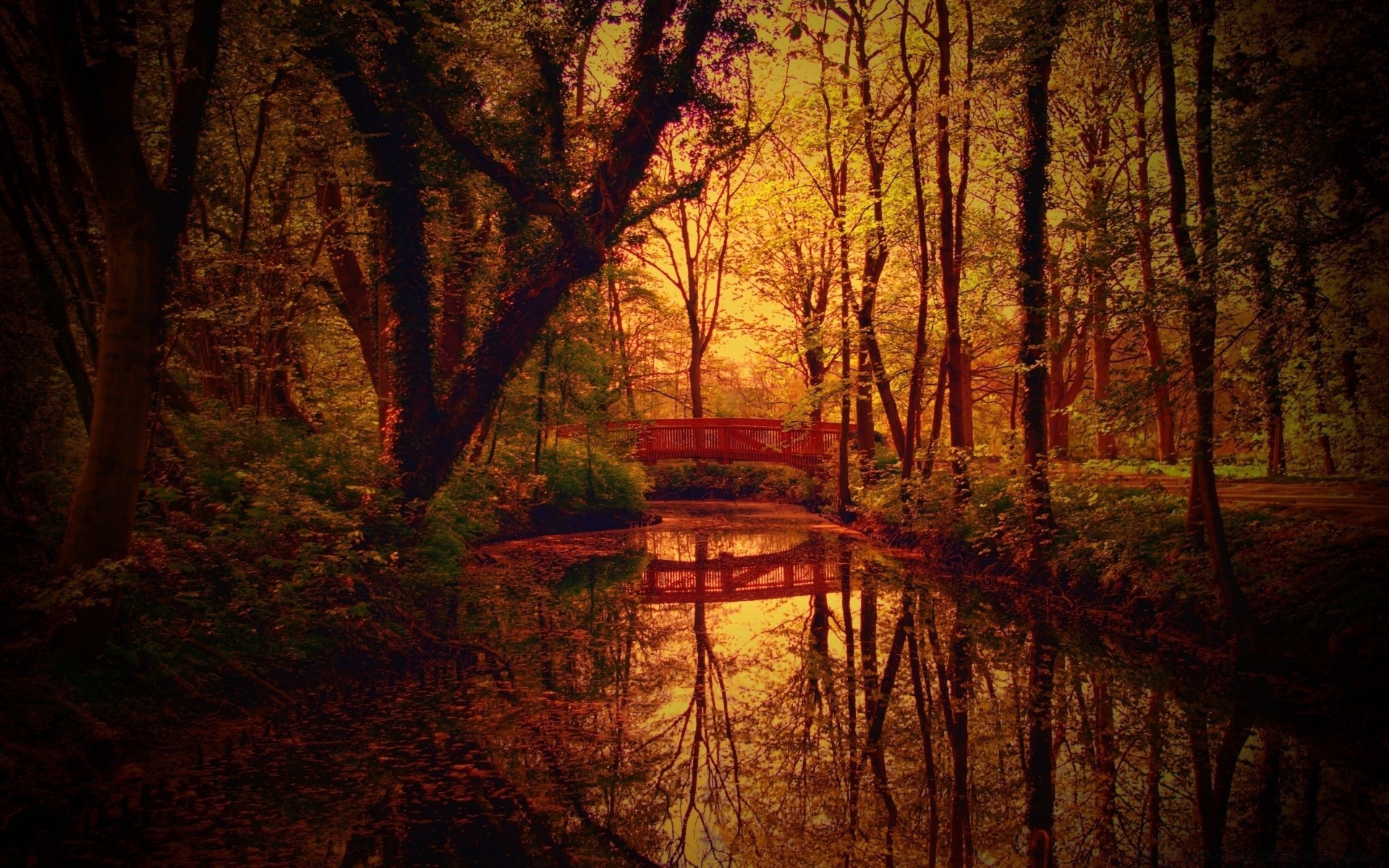 Il sole penetra attraverso il fogliame illuminando il fiume con i suoi raggi