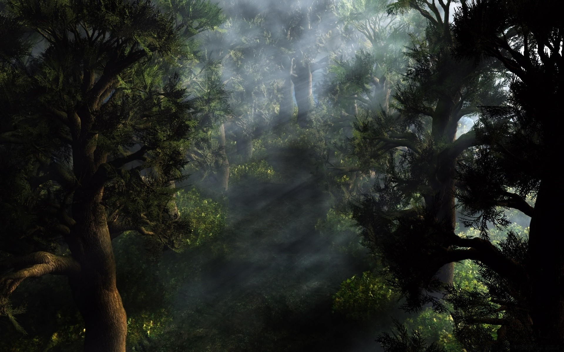 Paesaggio misterioso, raggi di sole che si fanno strada attraverso la forestaPaesaggio misterioso, raggi di sole che si fanno strada attraverso la foresta