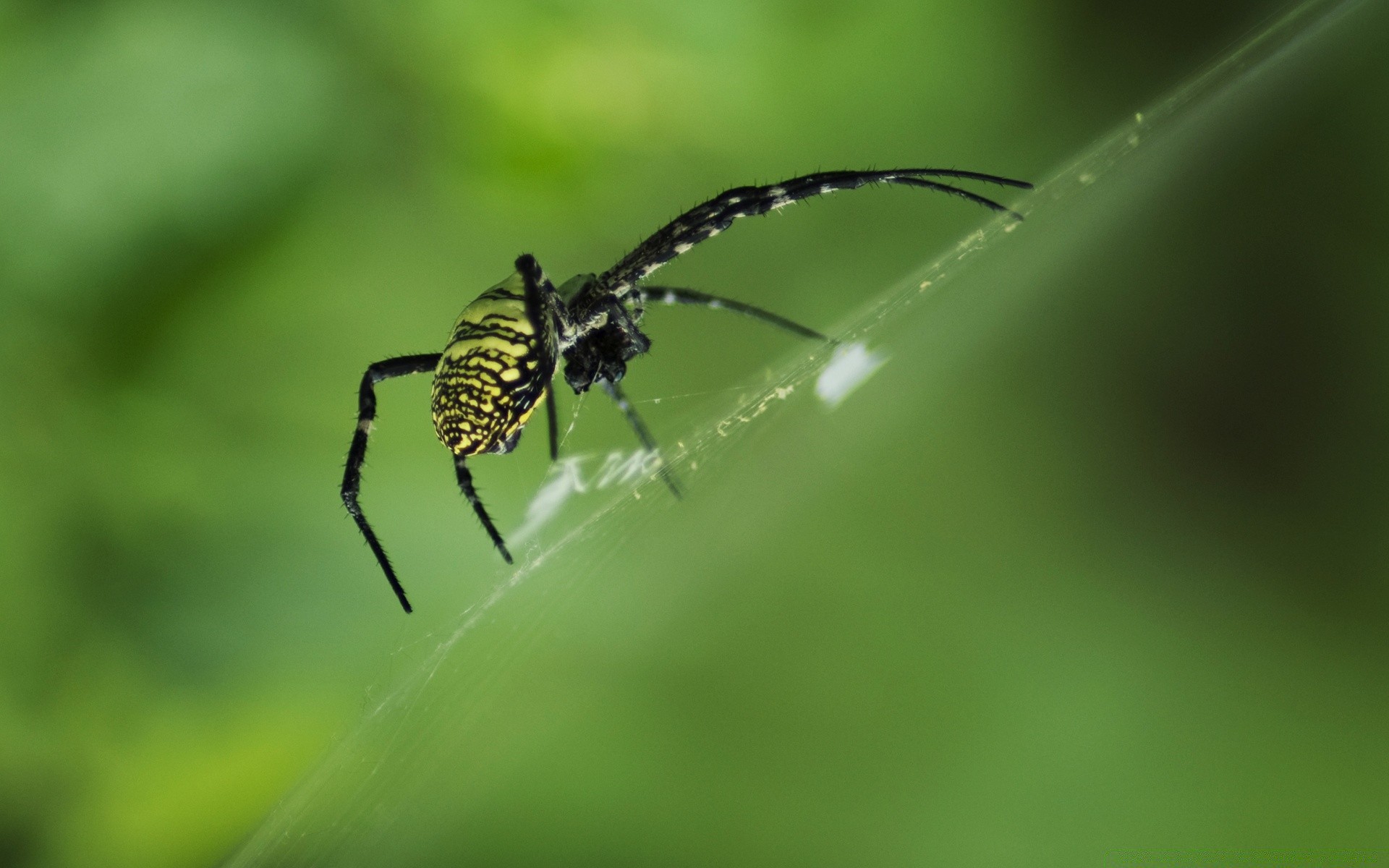 Ragno giallo-nero in piedi su una ragnatela su uno sfondo di verde