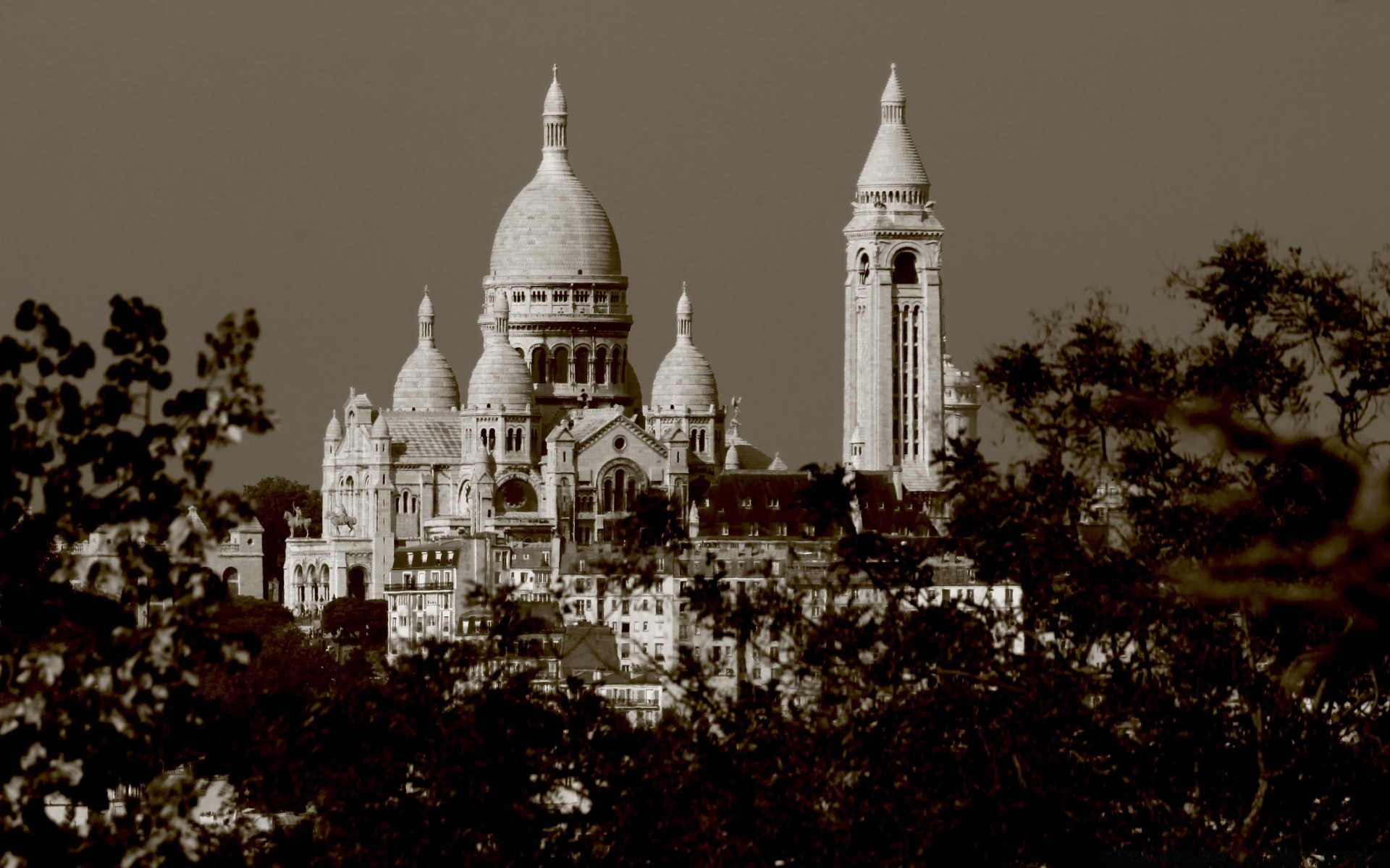 Immagine in bianco e nero di un punto di riferimento da dietro le corone degli alberi