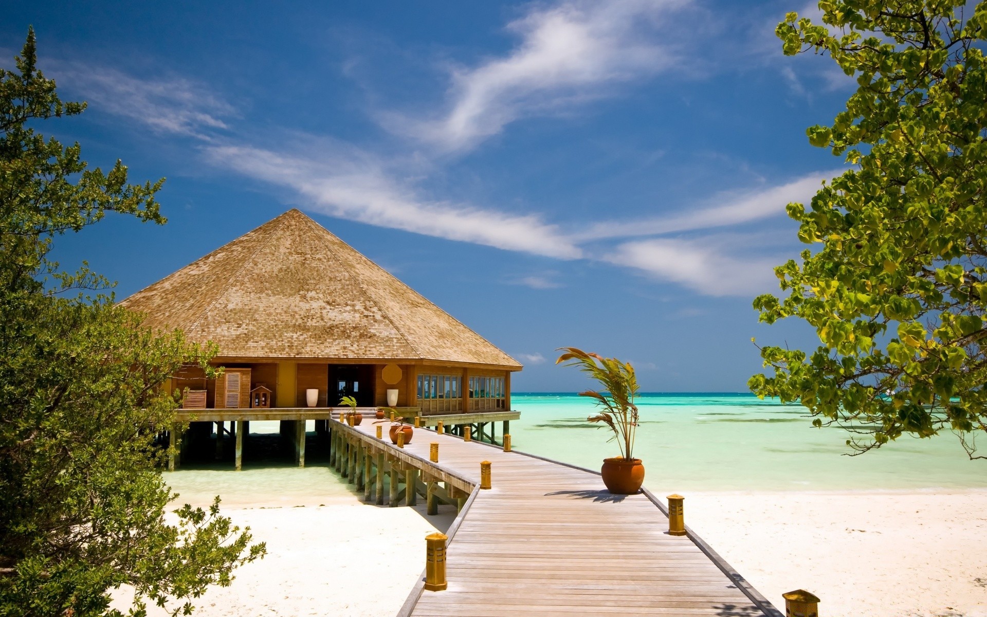 Viaggio su un'isola con case bungalow. Vacanze al mare
