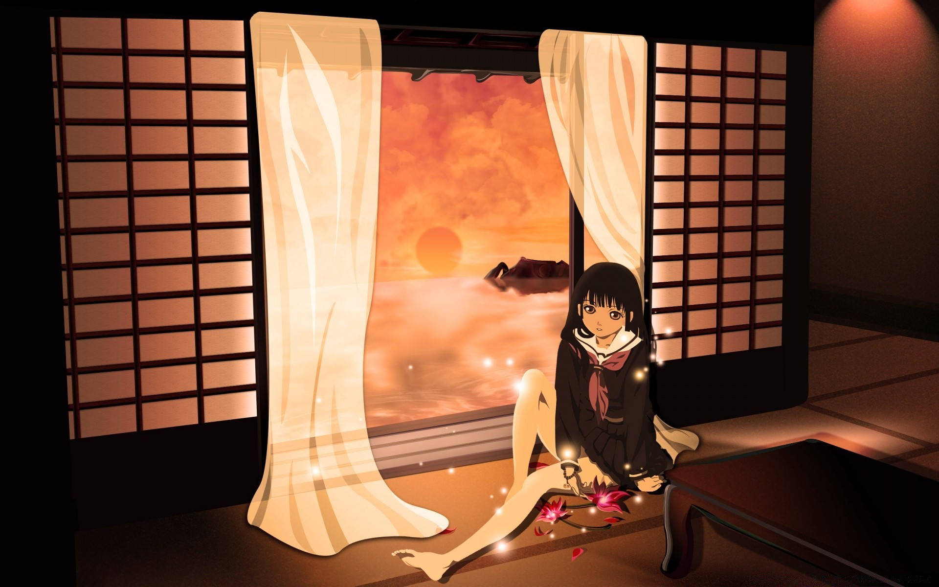Anime ragazza sul divano Vicino alla tenda della doccia
