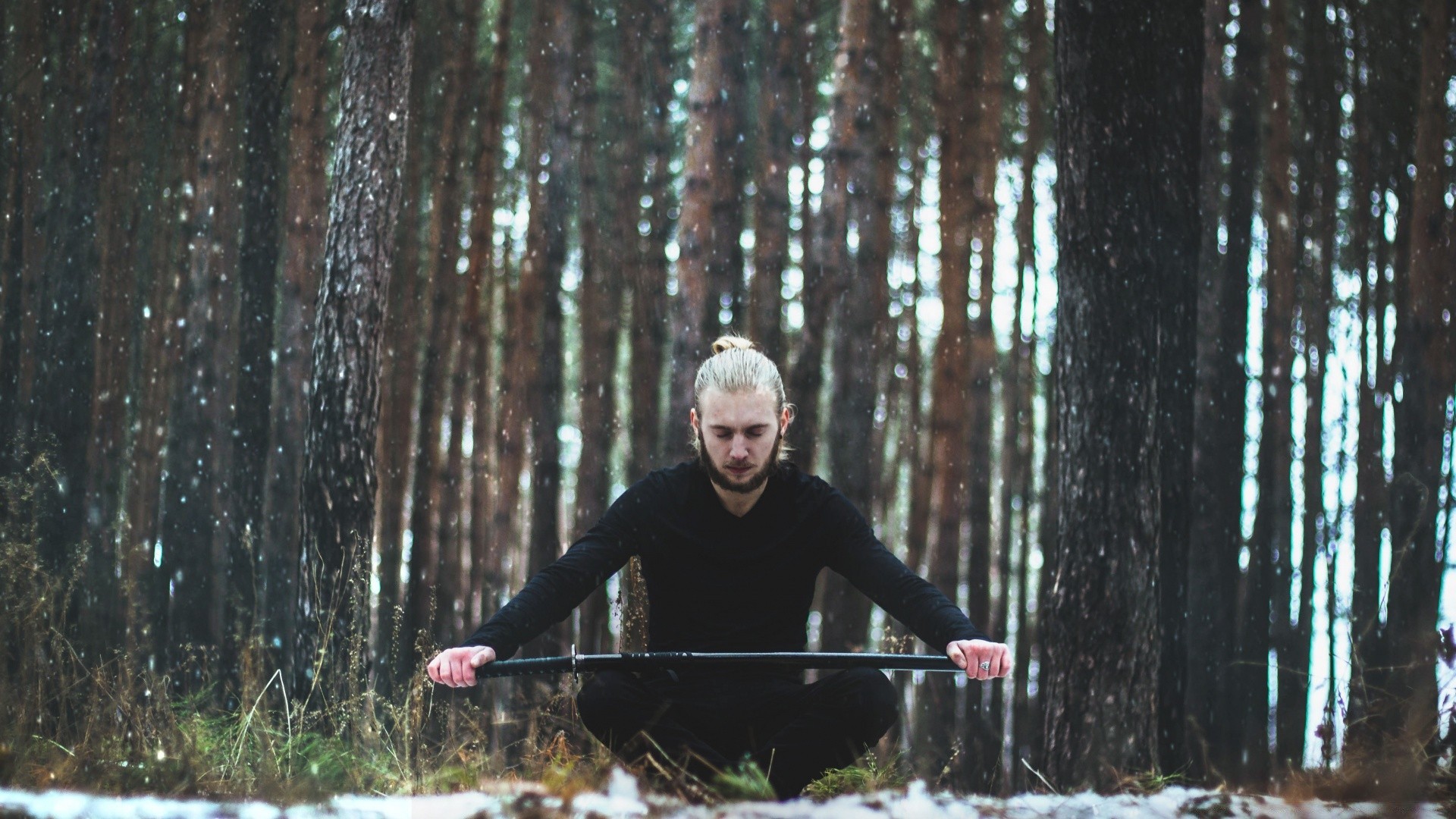 Uomo con una spada sullo sfondo di tronchi d'alberoUomo con una spada sullo sfondo di tronchi d'albero