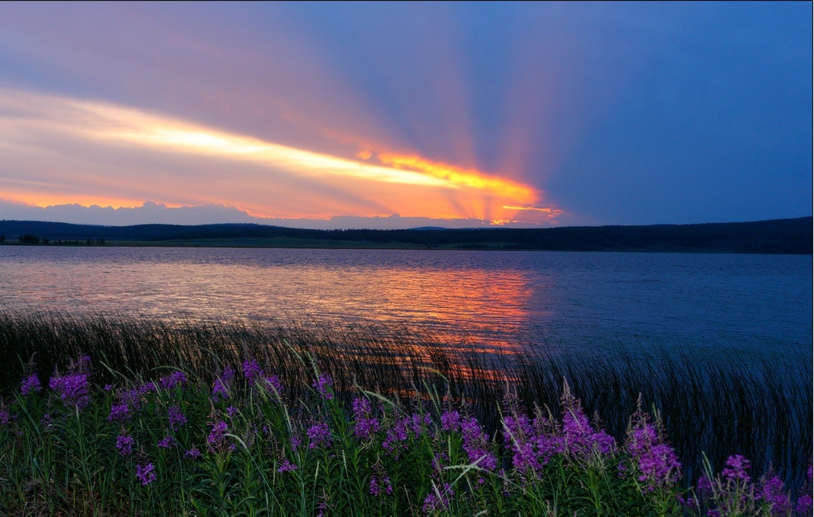 Vista della riva erbosa, del lago e dell'alba che si avvicina