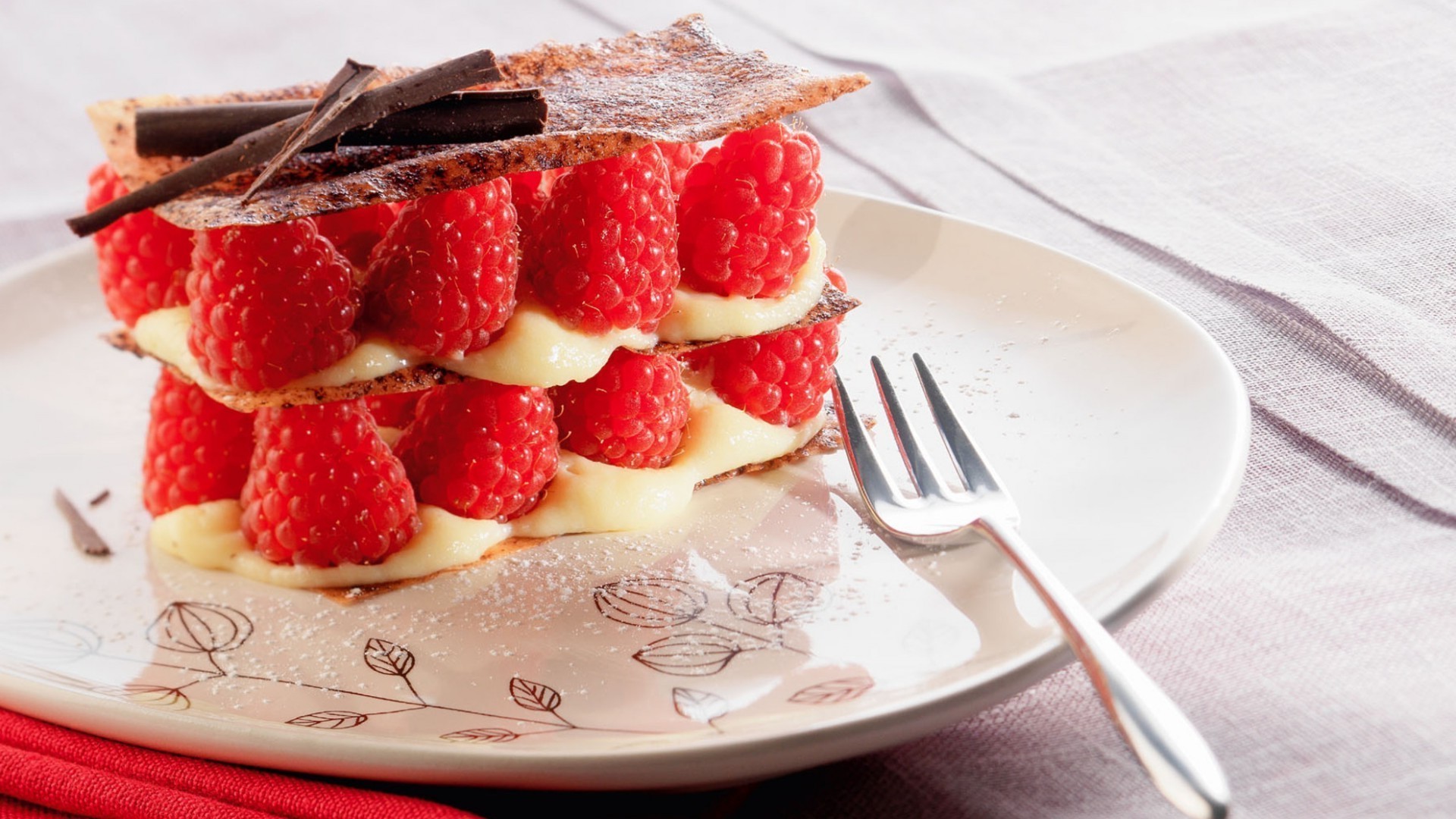 Dessert con lamponi su un piatto con una forchetta