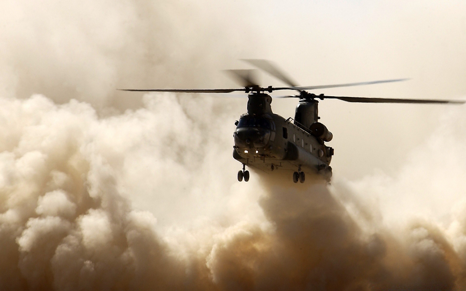 Gli elicotteri decollano al tramonto
