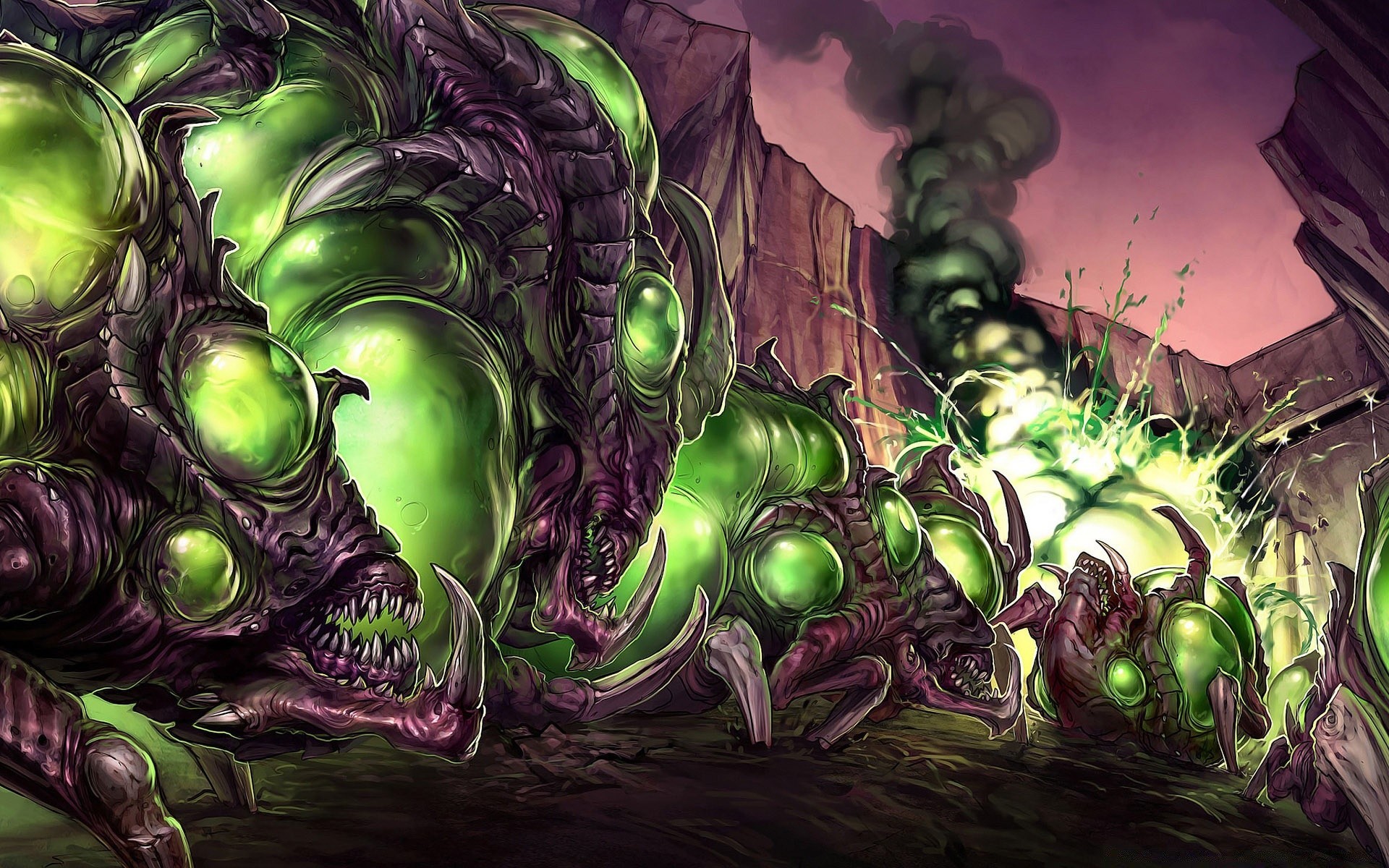 Illustrazione pittorica di alieni su uno sfondo di fuoco