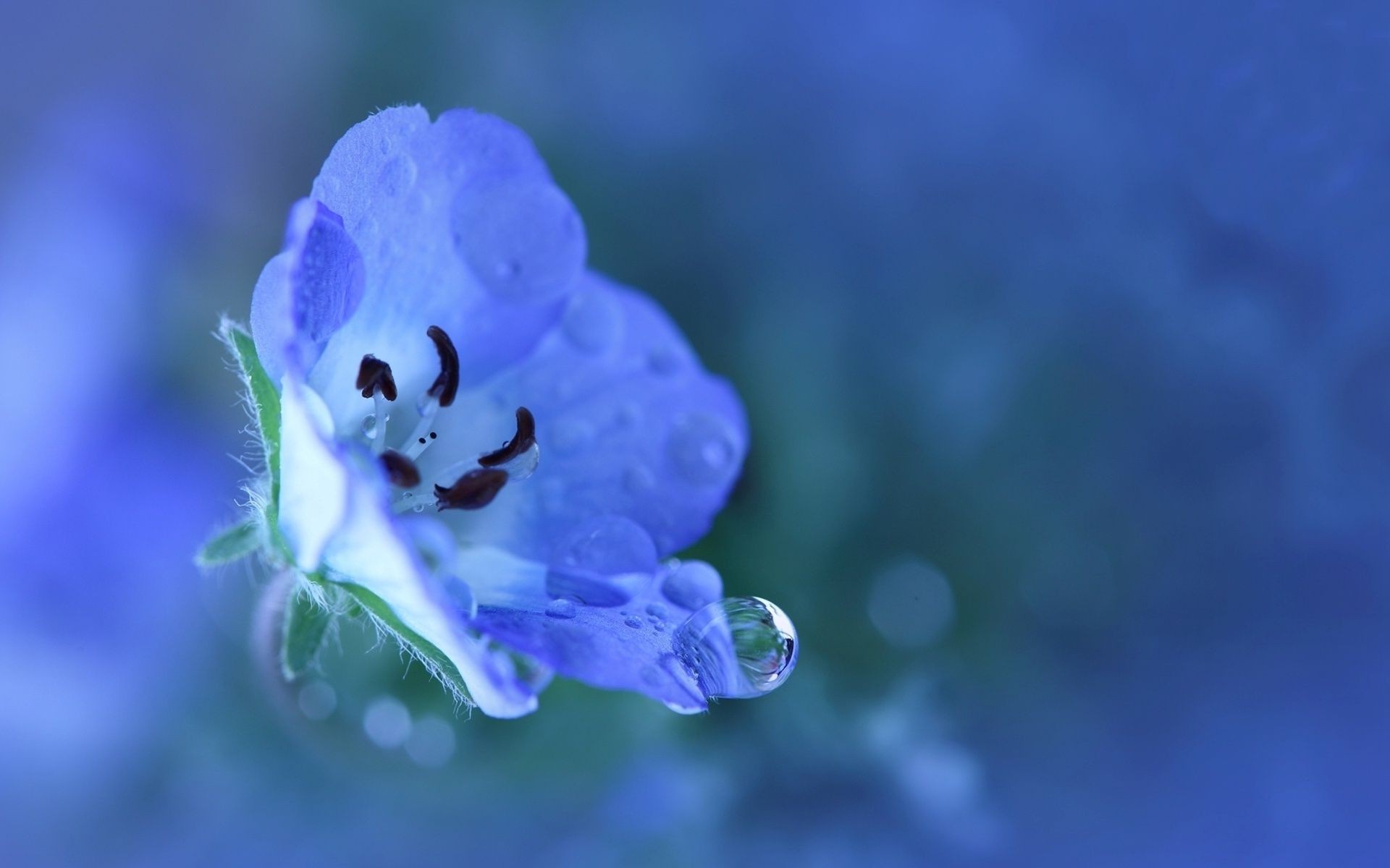 Delicato fiore blu con goccia di rugiada