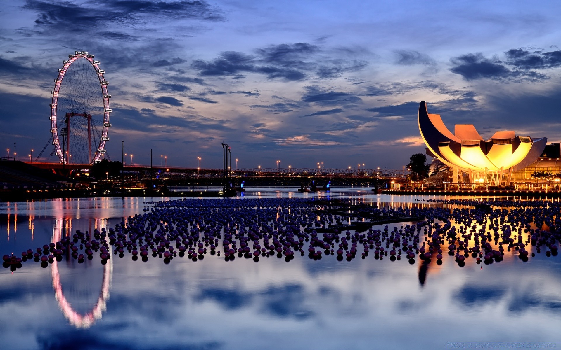 Riflessi della ruota panoramica nella superficie del fiume megalopoli