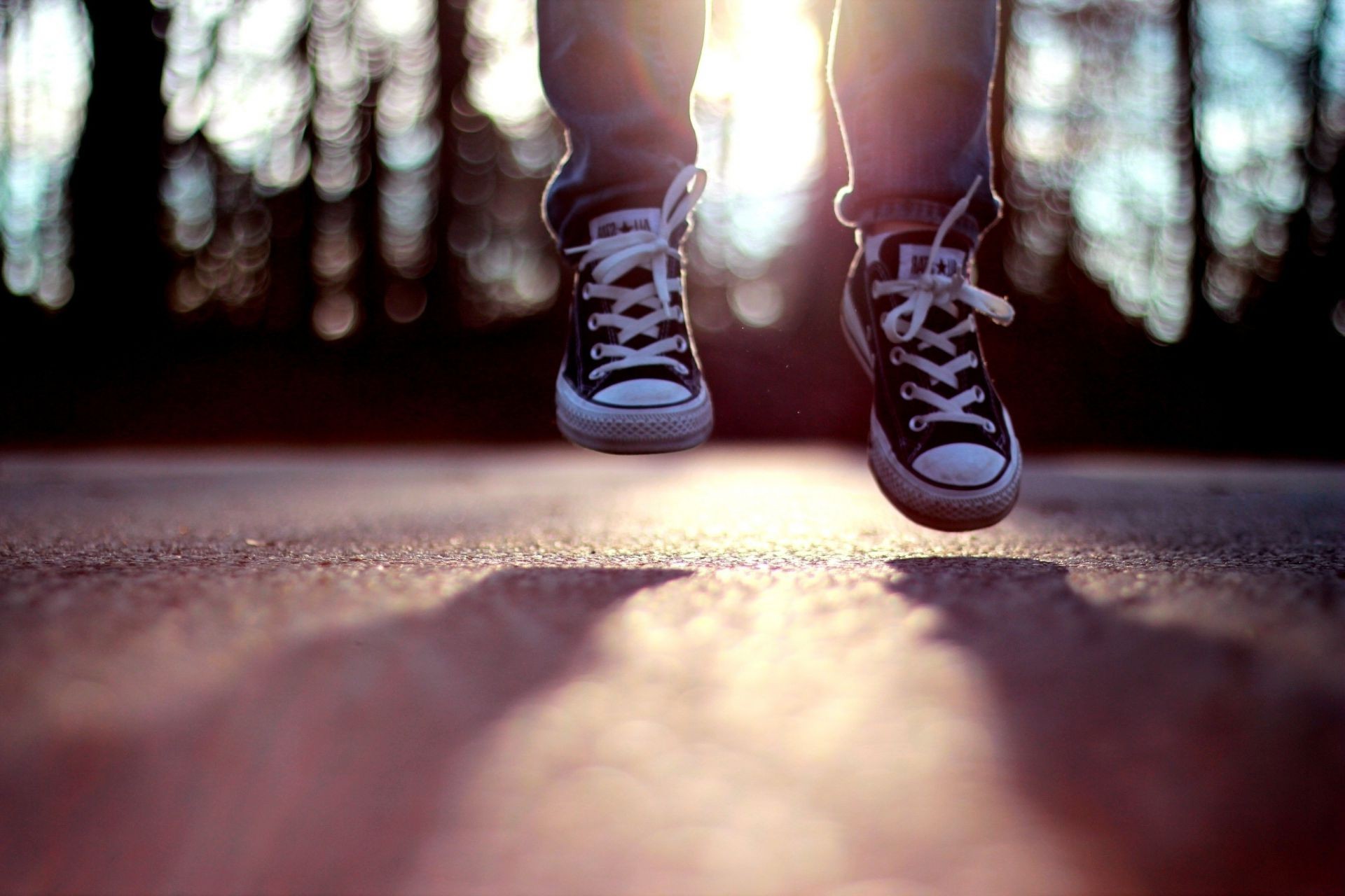 Piedi in scarpe da ginnastica su un muro di pietraPiedi in scarpe da ginnastica su un muro di pietra