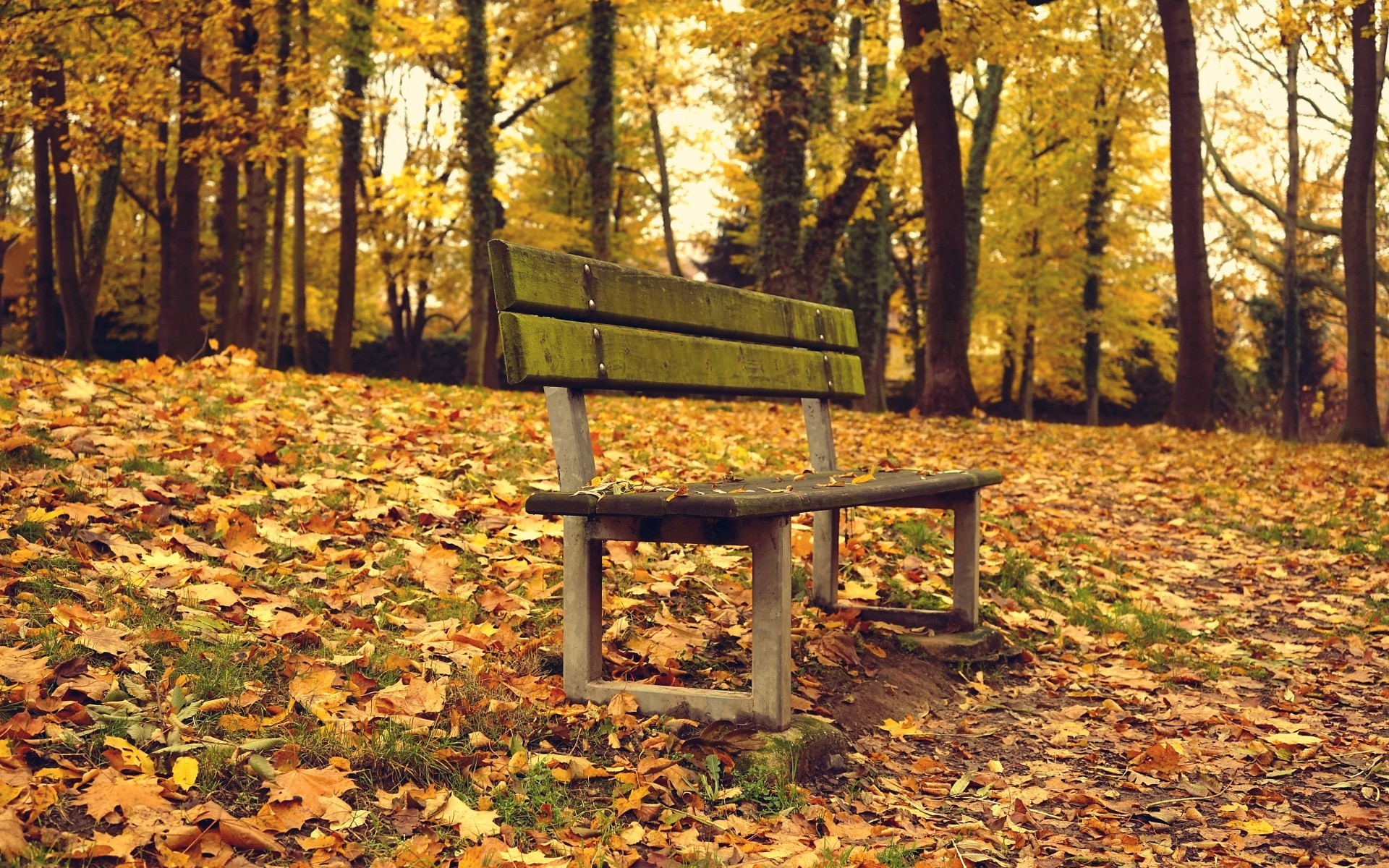 Una panchina di legno si trova nella foresta autunnale tra le foglie gialle cadute