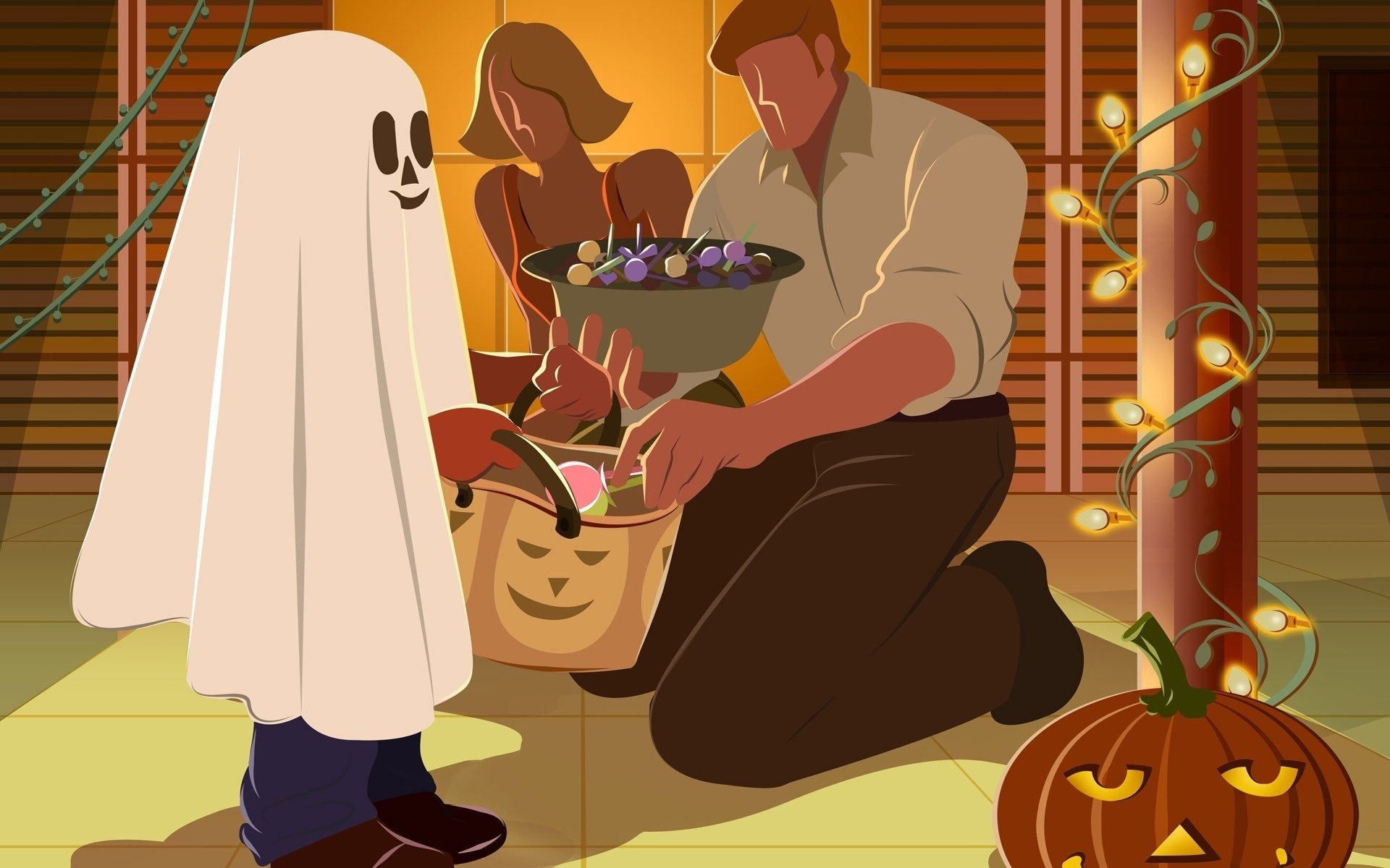 Coppia dà caramelle a un ragazzo travestito in un castCoppia dà caramelle a un ragazzo travestito in un cast