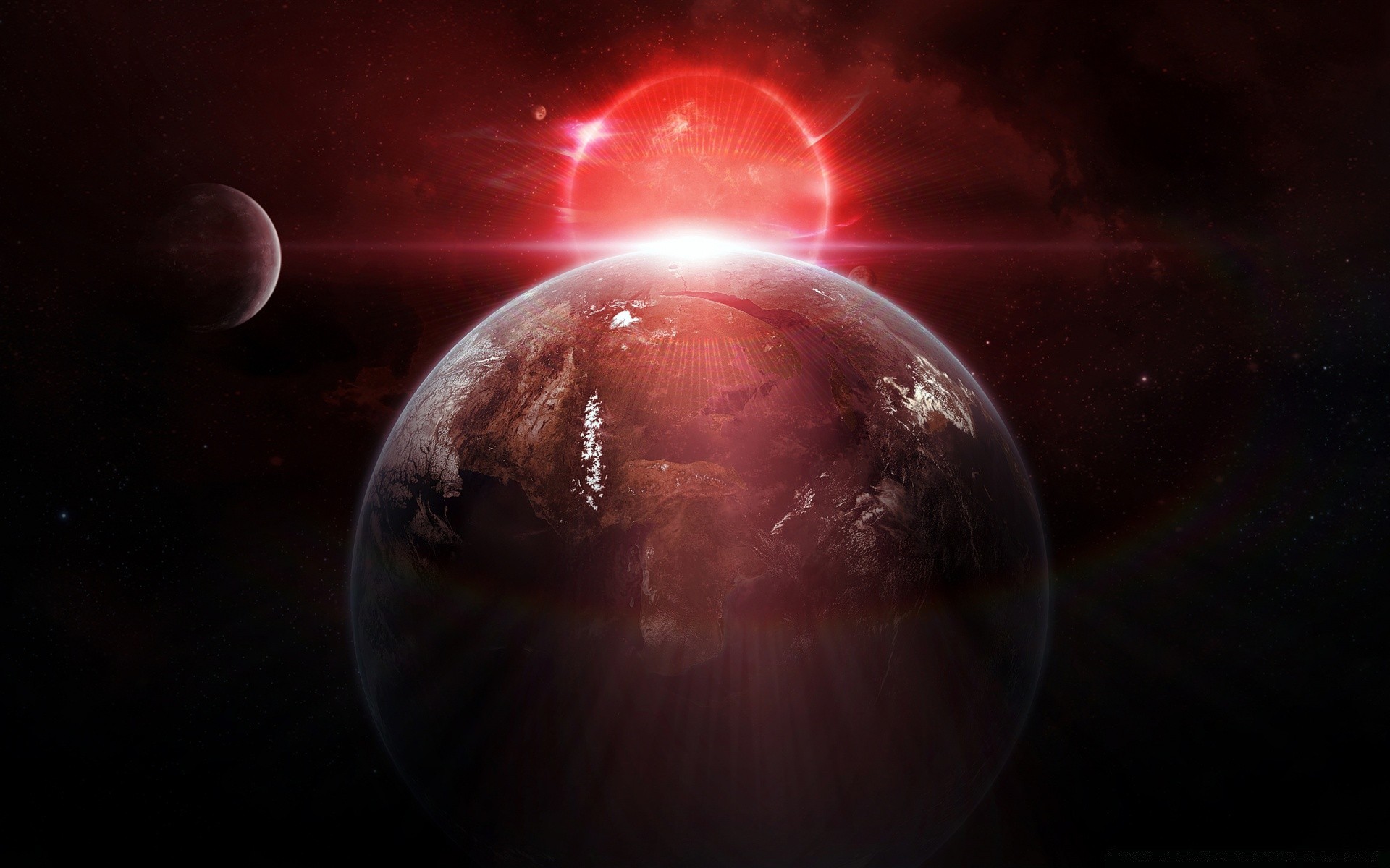 Visione creativa di pianeti con natura diversa sullo sfondo del cielo blu