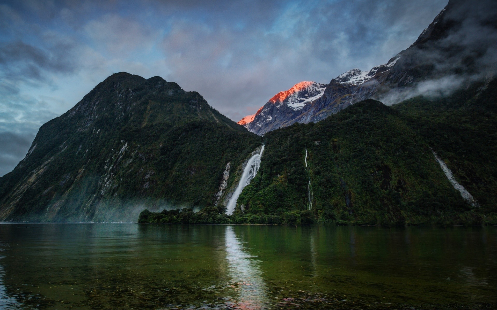 Bellissimo tramonto sullo sfondo di montagne e acquaBellissimo tramonto sullo sfondo di montagne e acqua