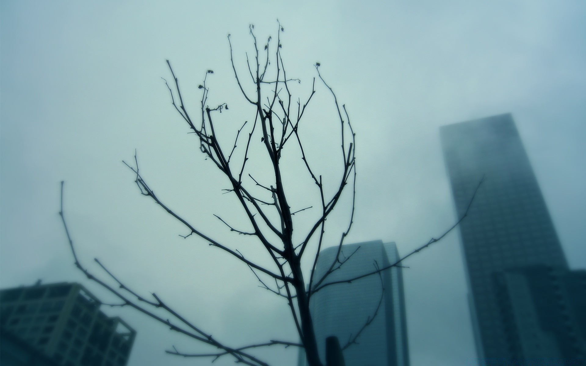 Grattacieli sullo sfondo di un ramoscello di un albero in una foschia grigiaGrattacieli sullo sfondo di un ramoscello di un albero in una foschia grigia