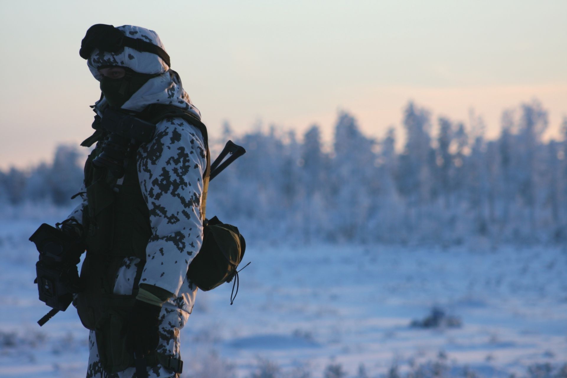 Uomo in mimetica sullo sfondo di un paesaggio invernaleUomo in mimetica sullo sfondo di un paesaggio invernale