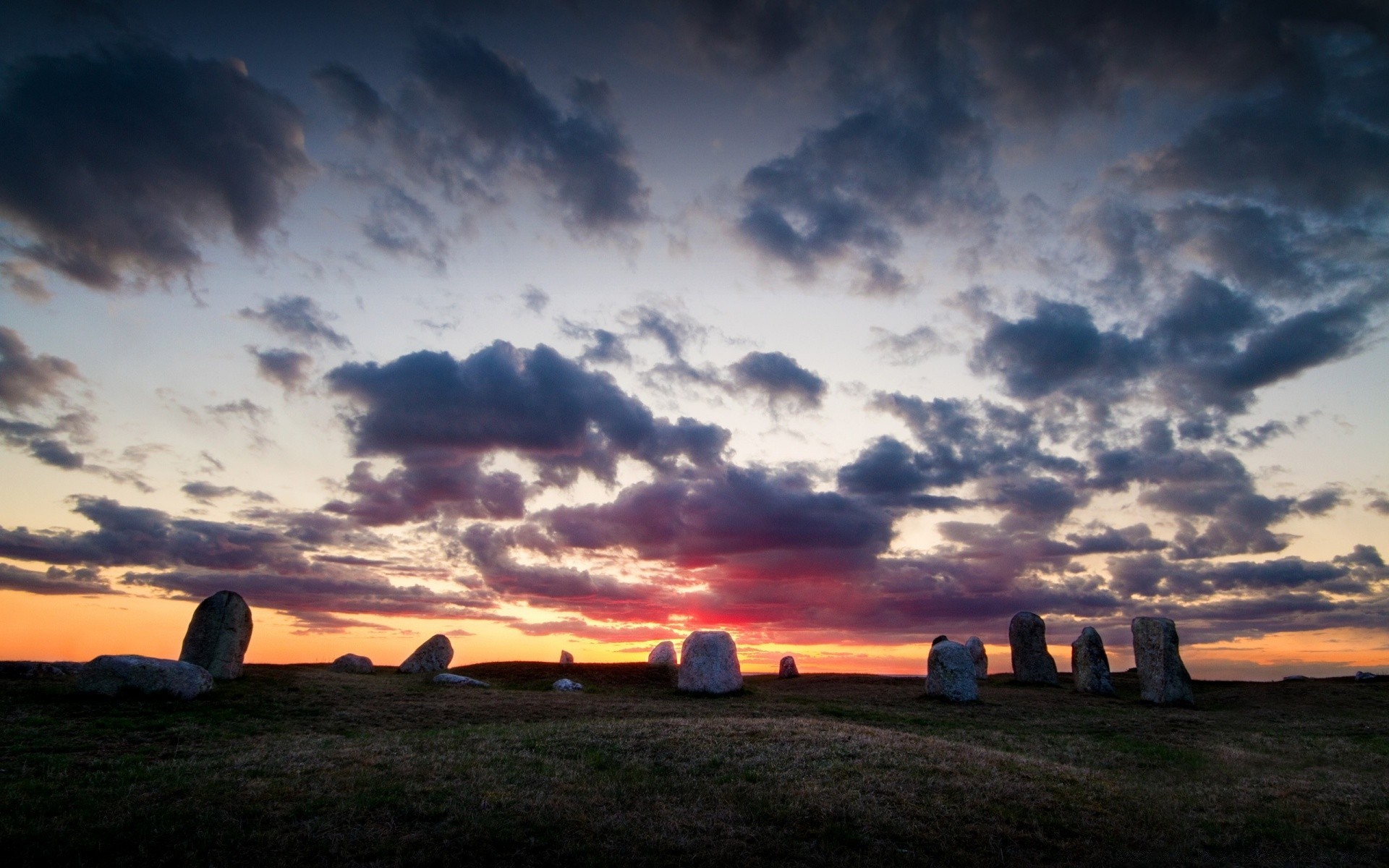 Tramonto nel campo, paesaggio con pietre solitarie