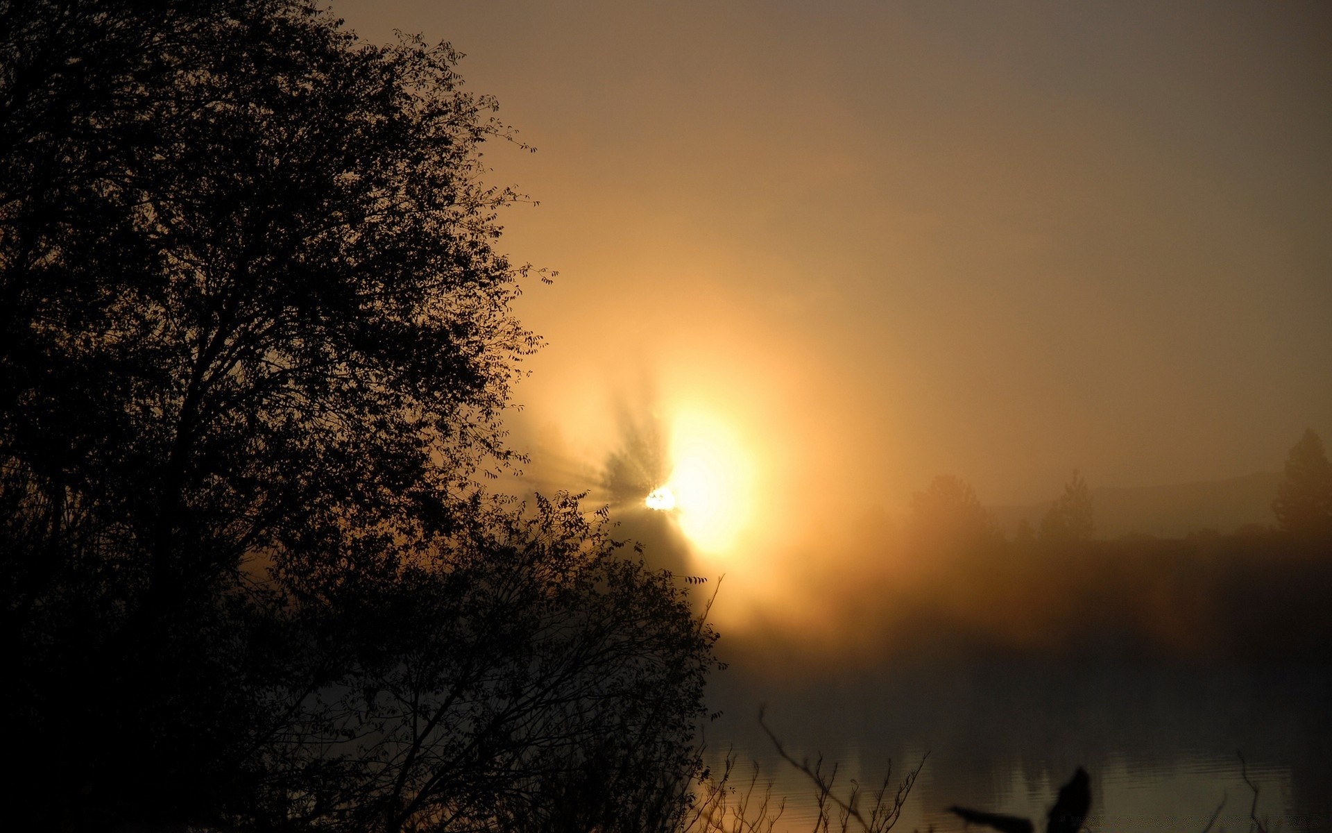 Il luminoso sole al tramonto si nasconde dietro il fogliame