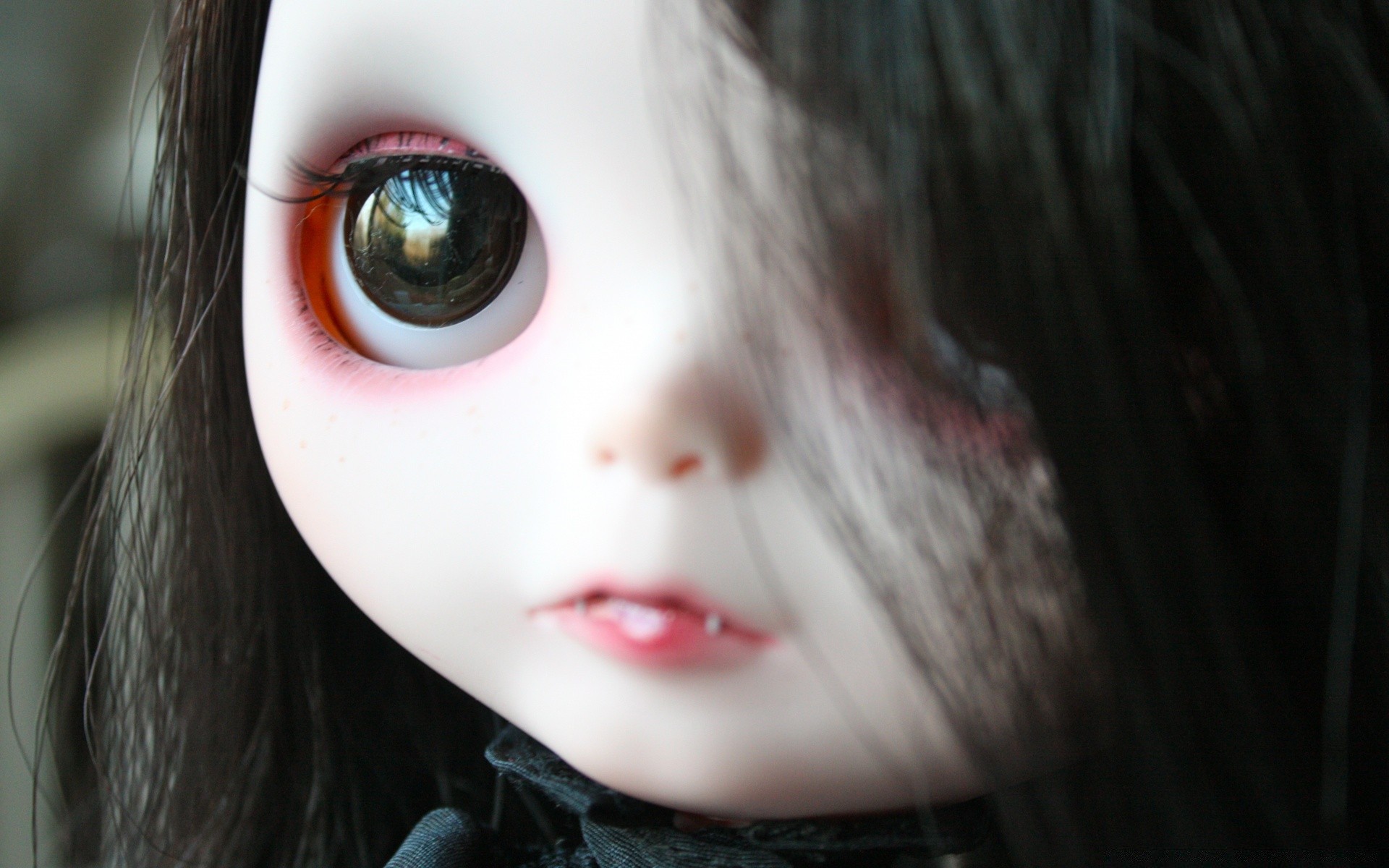 Ripresa del viso di una bambola dagli occhi a ciuffoRipresa del viso di una bambola dagli occhi a ciuffo