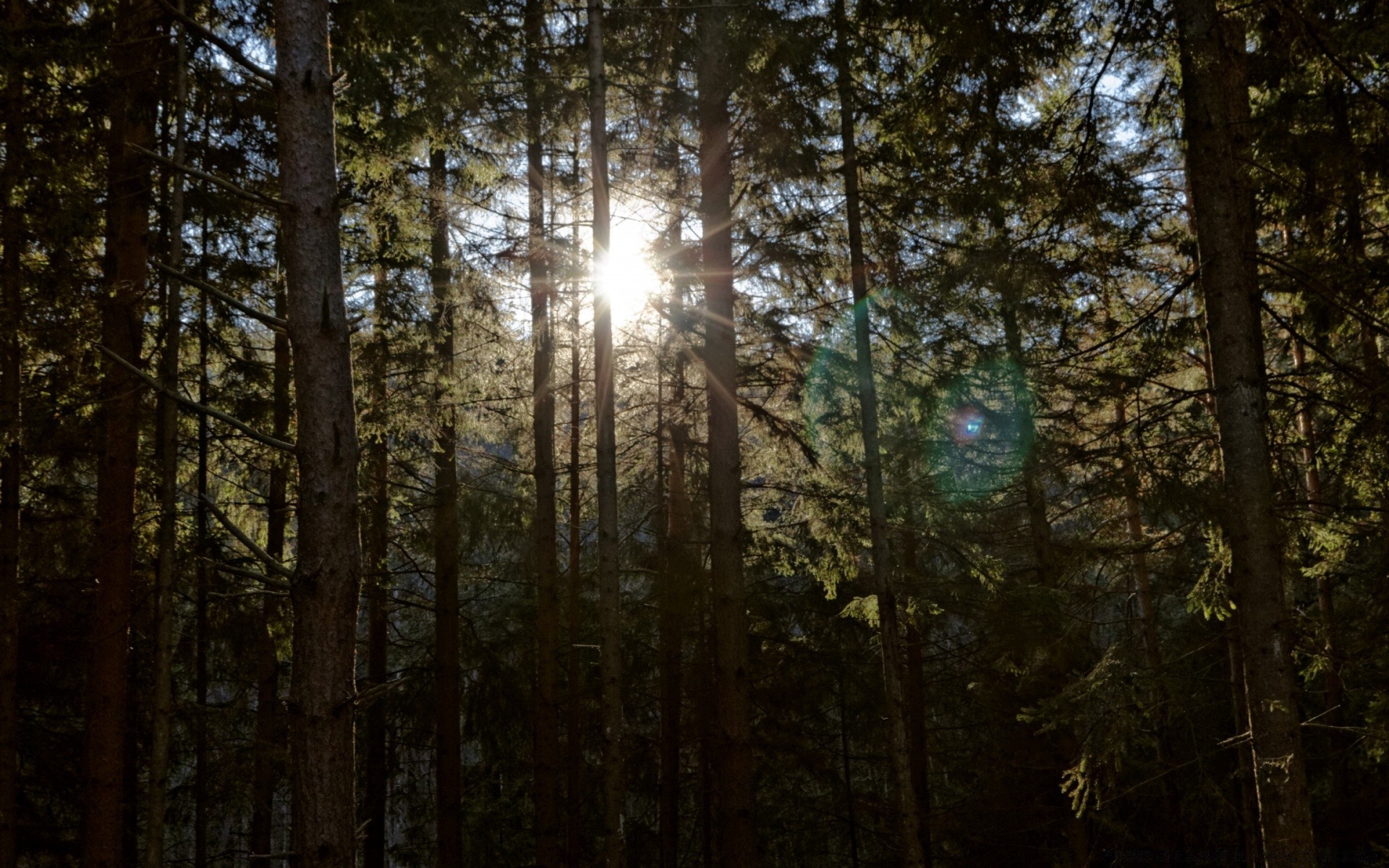 Il sole si fa strada tra le chiome degli alberi nella foresta