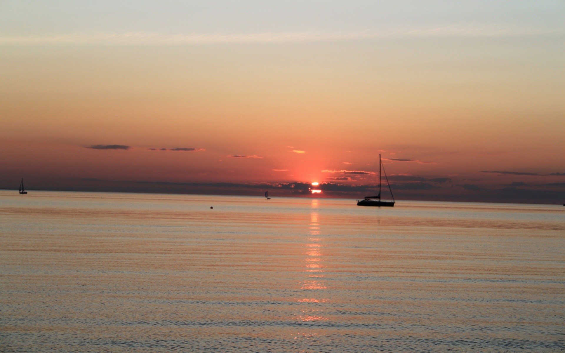 Barche sulla superficie del mare alla luce del sole al tramonto