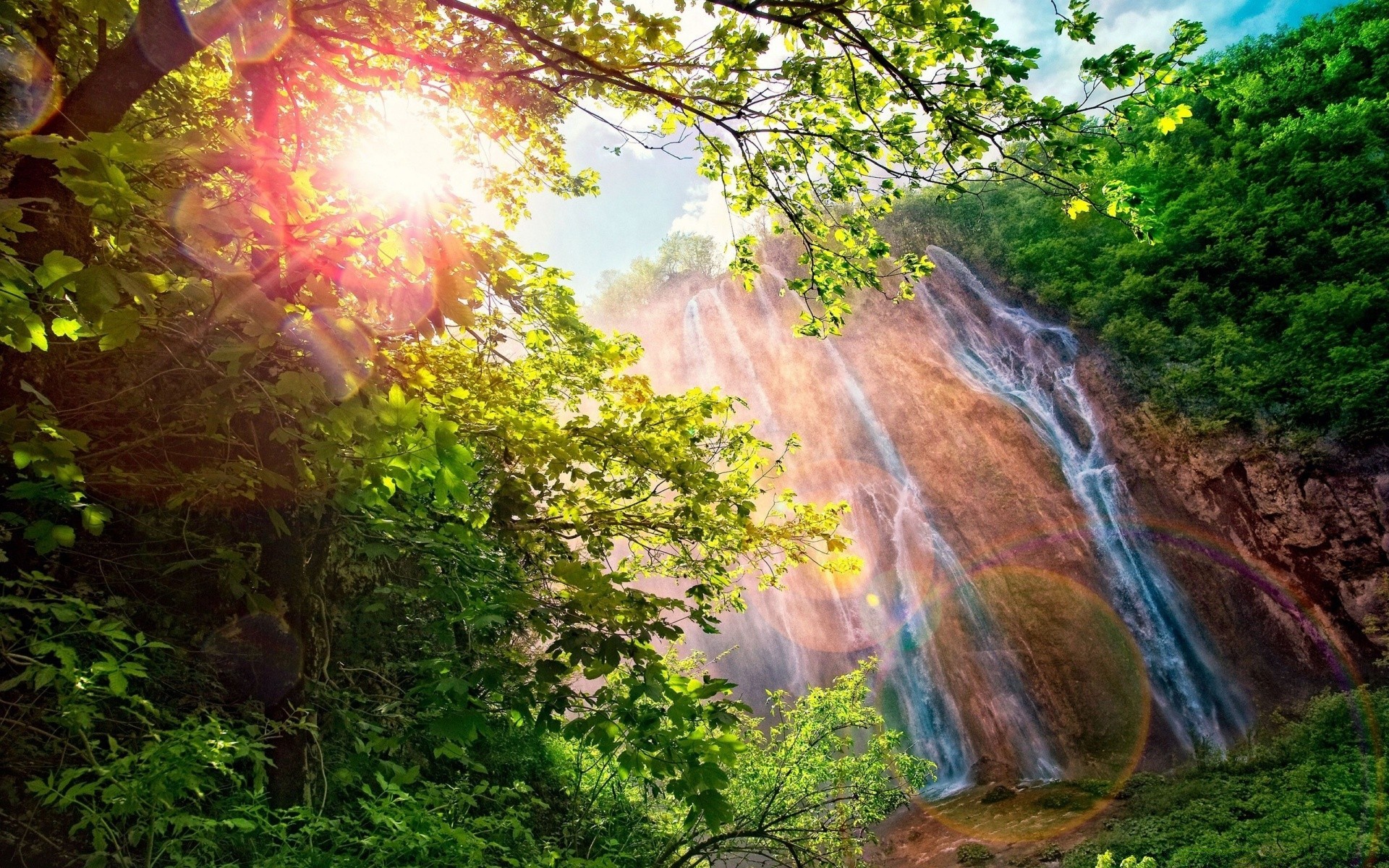 Il sole si fa strada tra le chiome degli alberi nella foresta