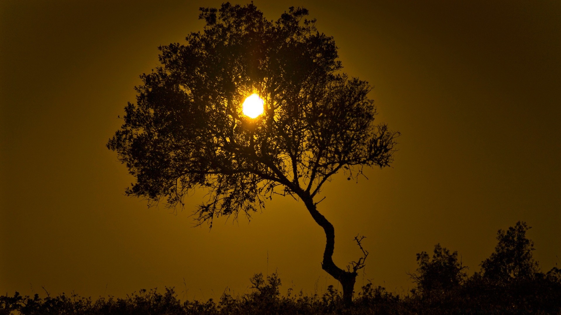 Un albero solitario sul campo sembra avvolgere il soleUn albero solitario sul campo sembra avvolgere il sole