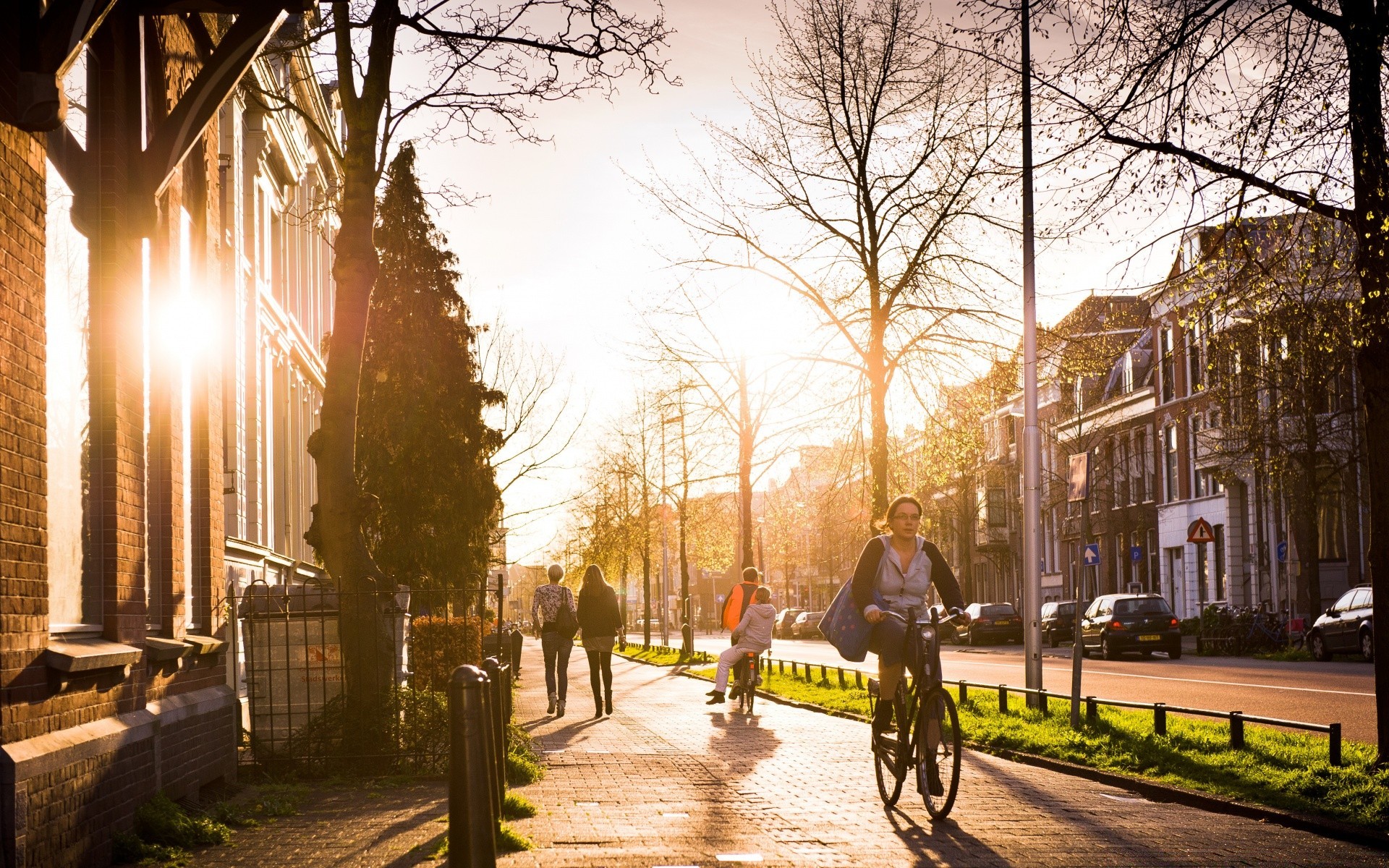 La mattina arriva in città, la strada è vuota sul marciapiede rari passanti nel sole autunnale