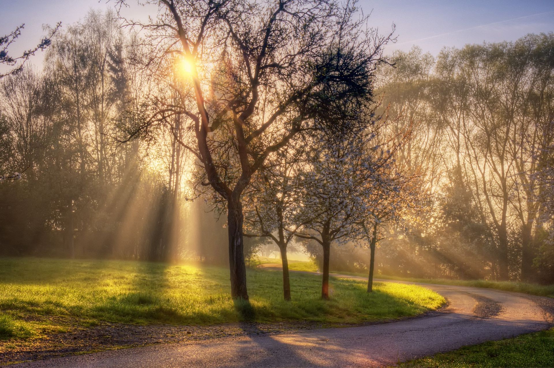 Un misterioso boschetto, raggi di sole attraverso il fogliame