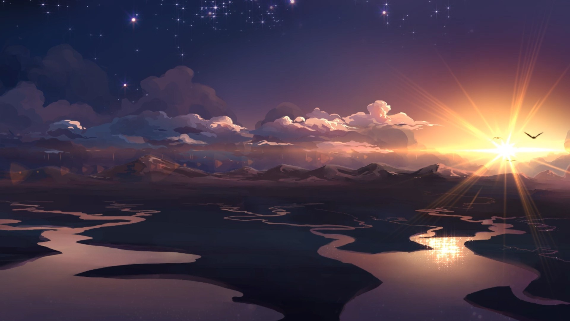 Sole al tramonto che fa capolino da dietro un albero sullo sfondo dell'acqua