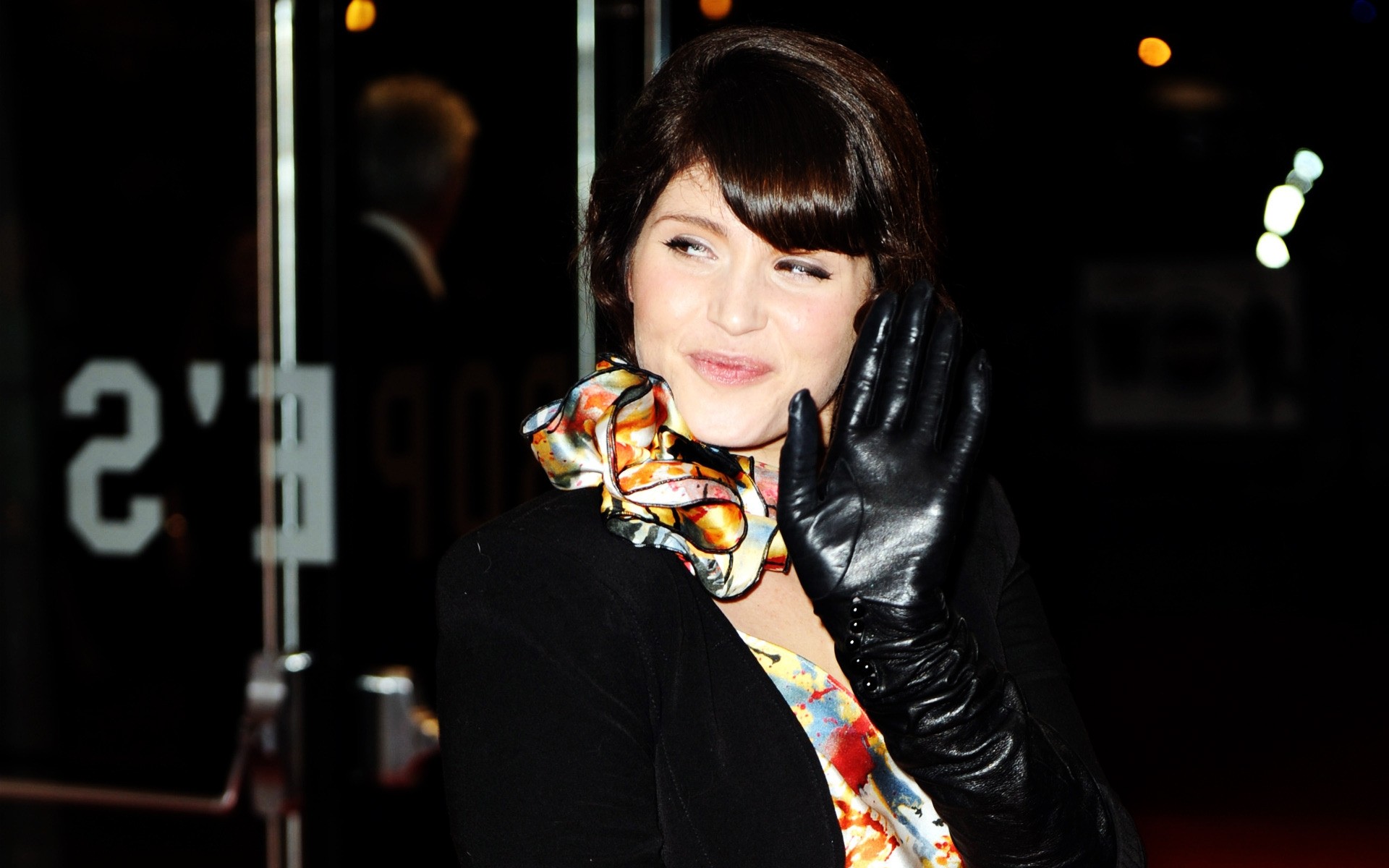 Donna guantata che agita la mano