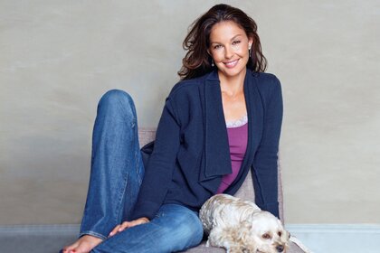 Donna sorridente in tuta seduta accanto al cane