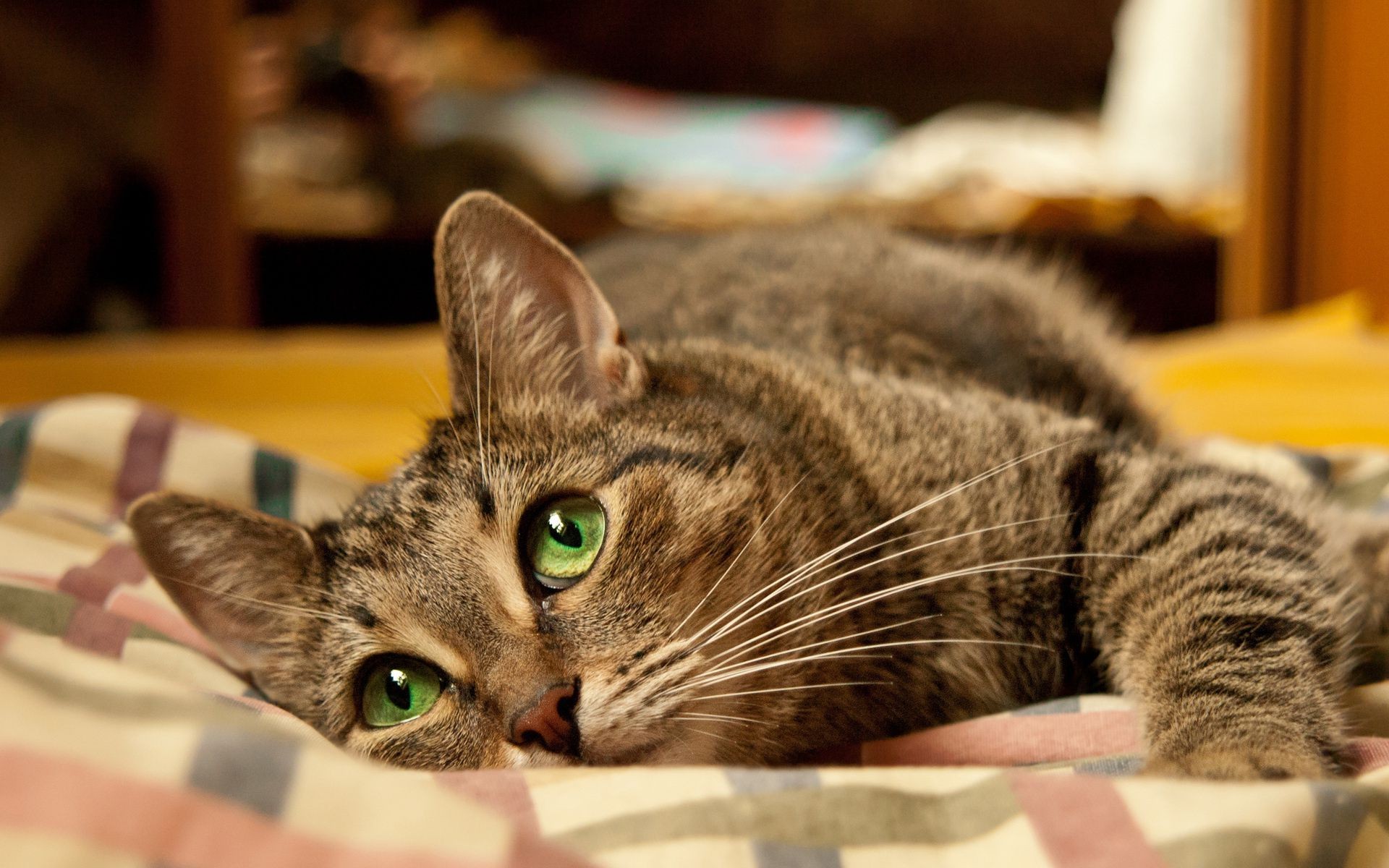 Sdraiato nella malinconia su una coperta gatto dagli occhi verdi