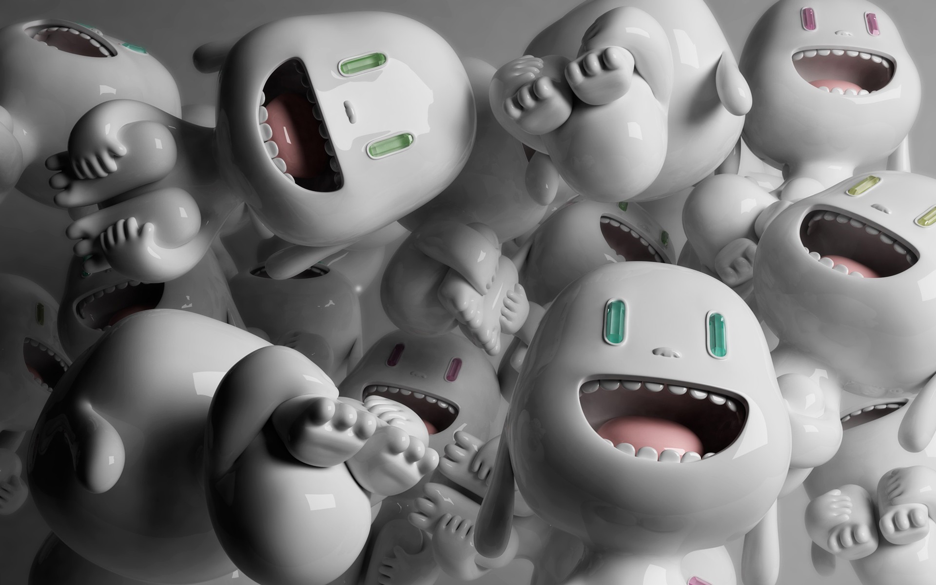 Un gruppo di lepri bianche minimaliste con un sorriso e occhi selvaggi