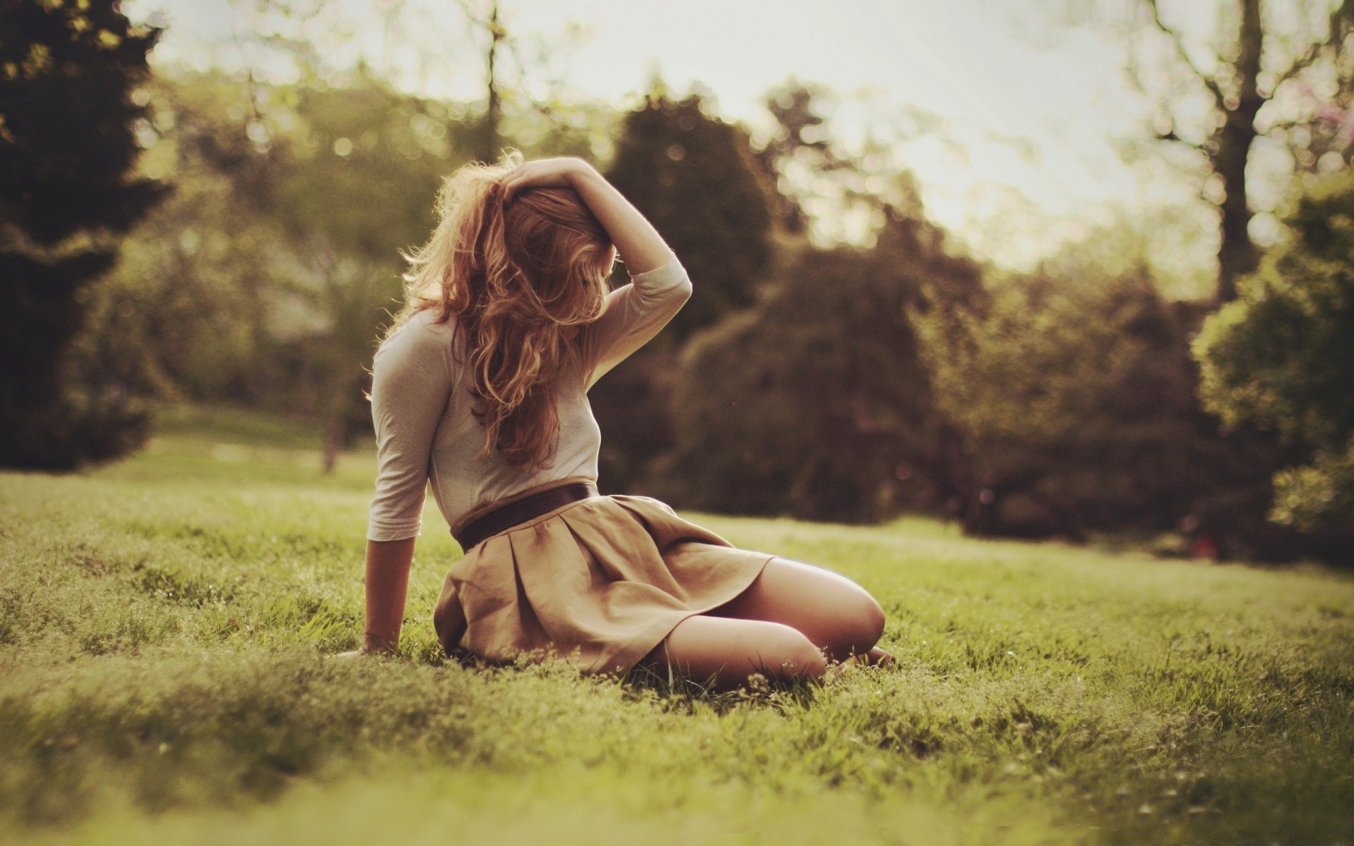 Ragazza con i capelli lunghi si trova e sorride nell'erba verde