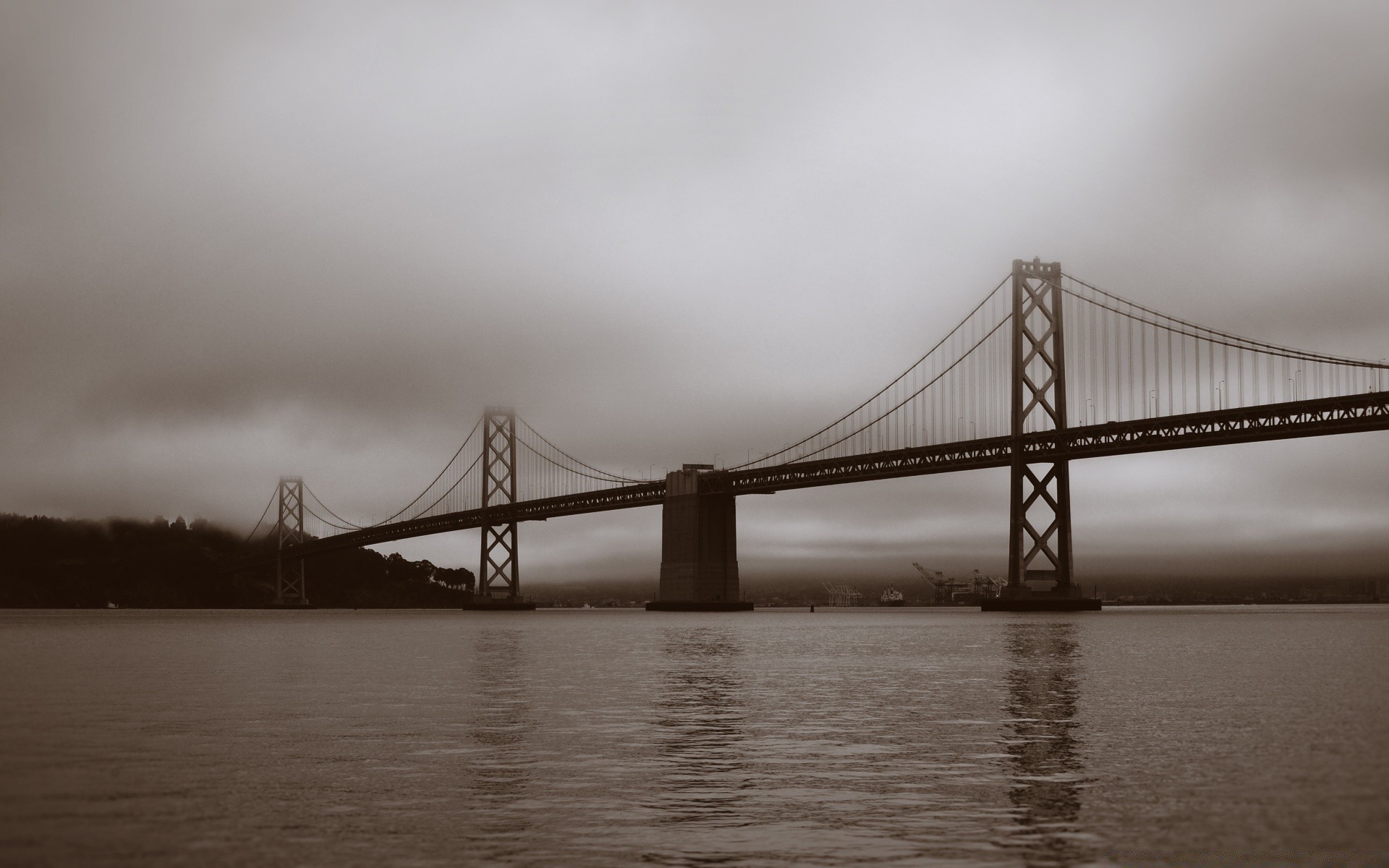 Foto in bianco e nero di un ponte sospeso nella nebbia