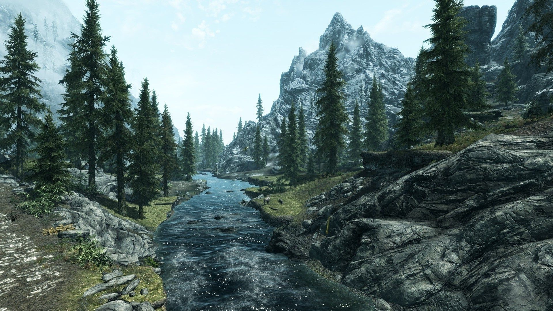 Il fiume di montagna scorre lungo i bordi del pino