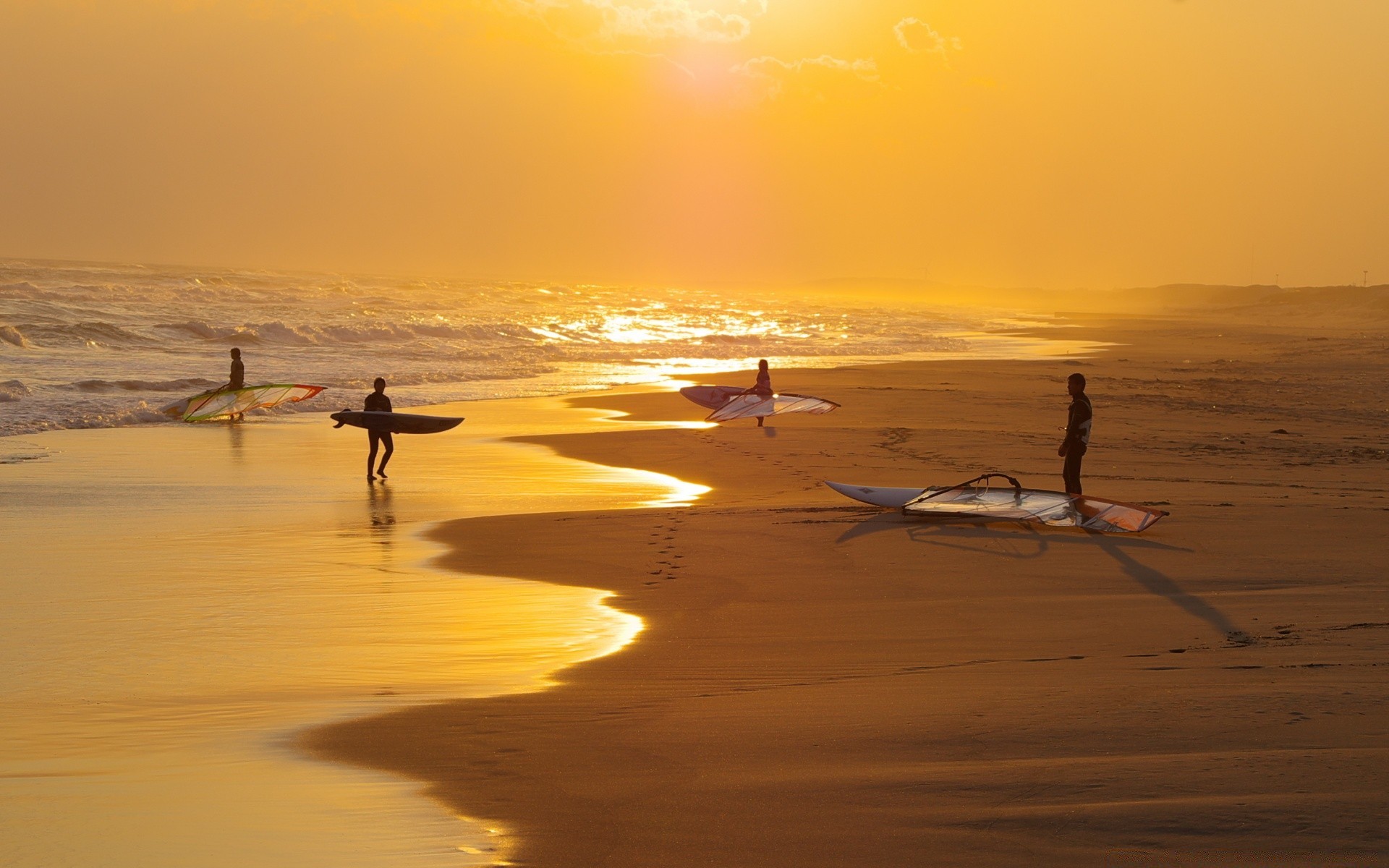 Persone con surf sulla spiaggia di sabbia al tramonto