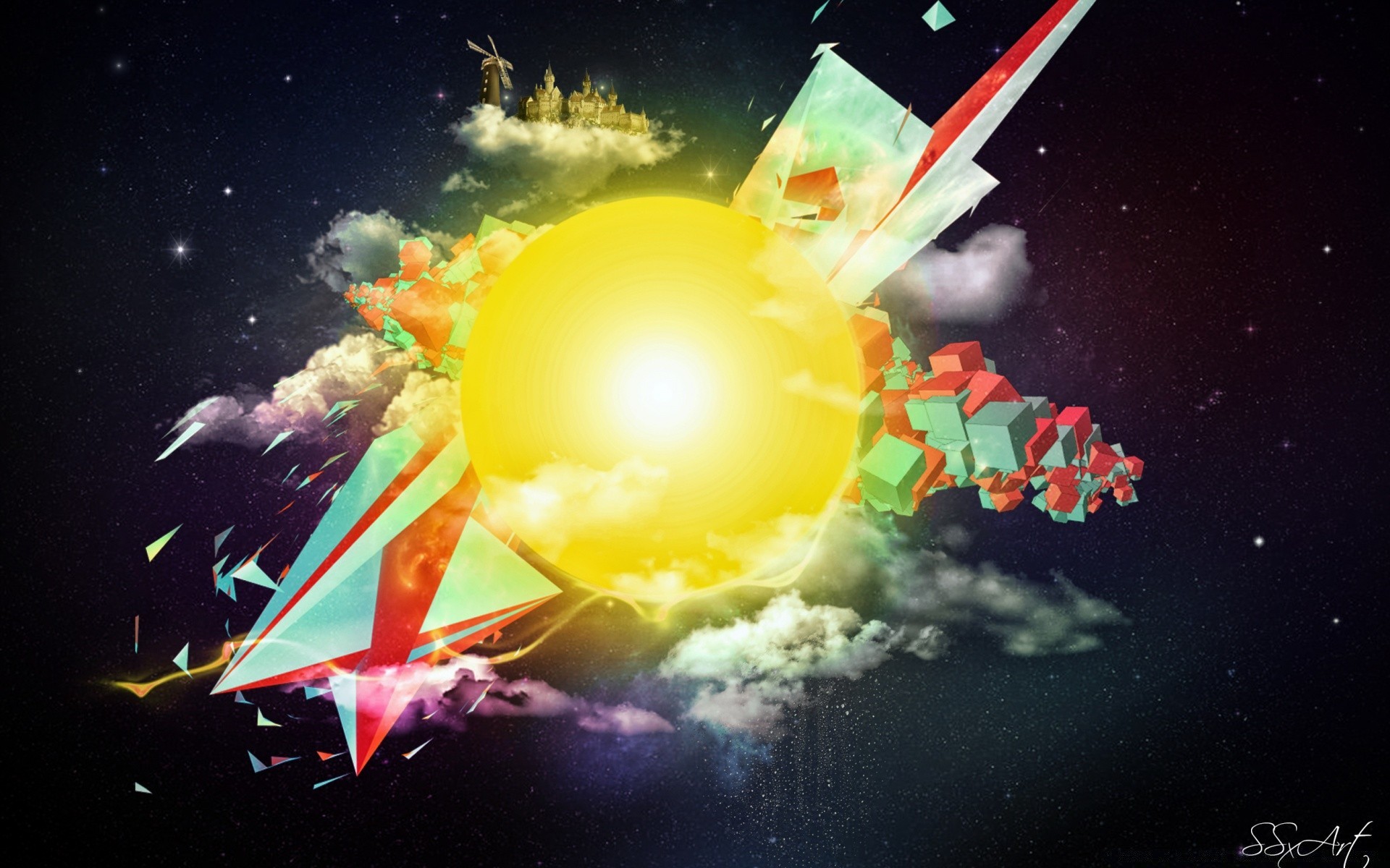 Casa solitaria sullo sfondo di una cometa e un pianeta