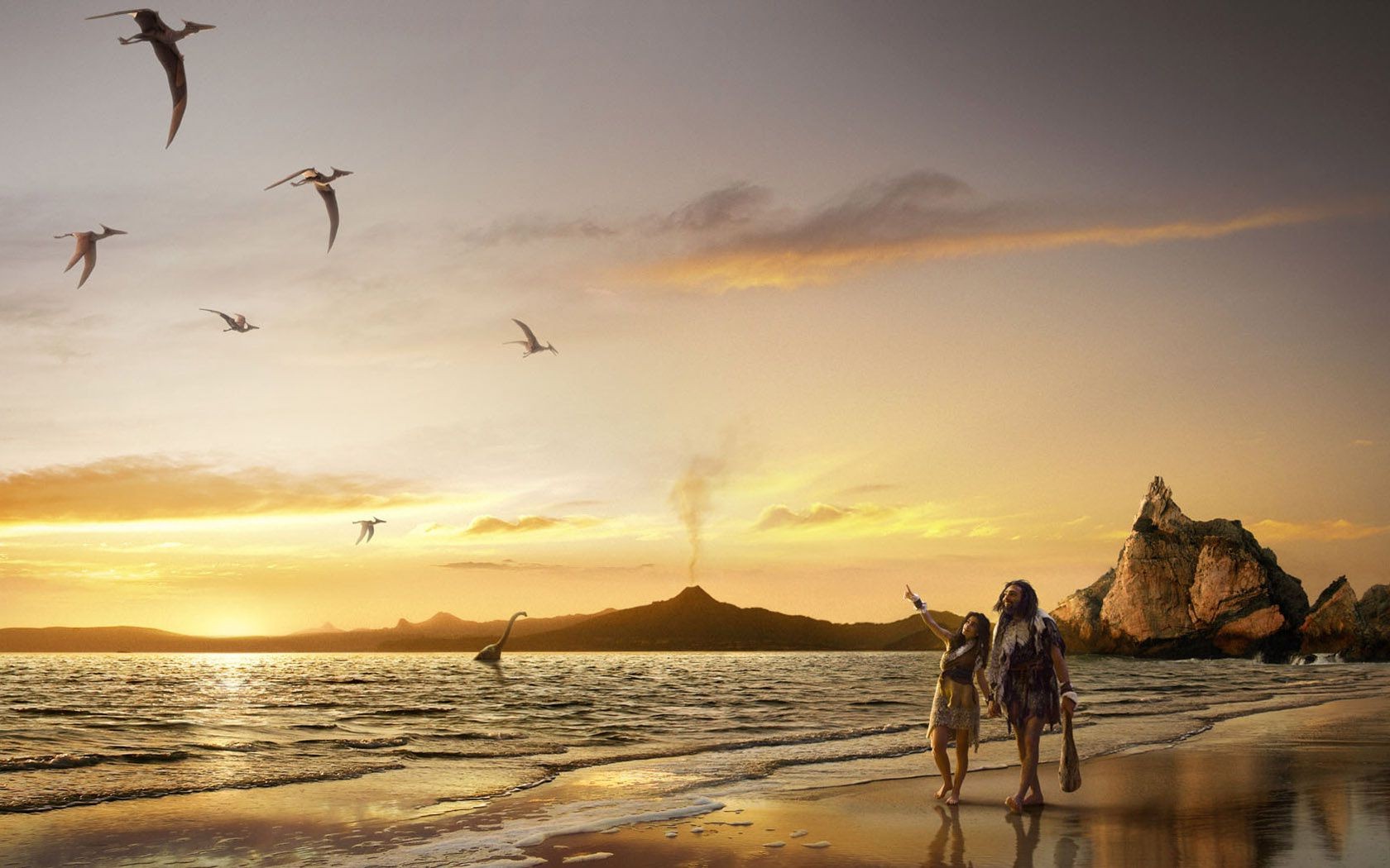 Passeggiata preistorica sulla spiaggia al tramontoPasseggiata preistorica sulla spiaggia al tramonto